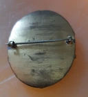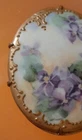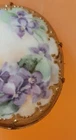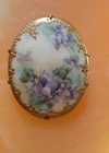 Handpainted on Porcelain 2 inch Victorian Brooch. Uncleaned item with wear on Gold Pin has a slight bend in it but works fine. I believe these are Violets. Gold Over Brass I believe. Untested Metal. Thanks for looking!