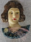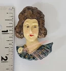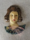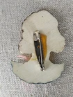 This brooch would look great clustered with other fun and funky pieces! The material has the look of hand painted porcelain, but the dimensional aspect and feel of it makes me believe it is made of resin. This piece is in good condition for its age and pre-owned status. The closure is glued on and works well. I can't tell if there was a gem or sequin at the base of the feather. It looks good without anything there, or you could add some bling there if you wanted a different look.
