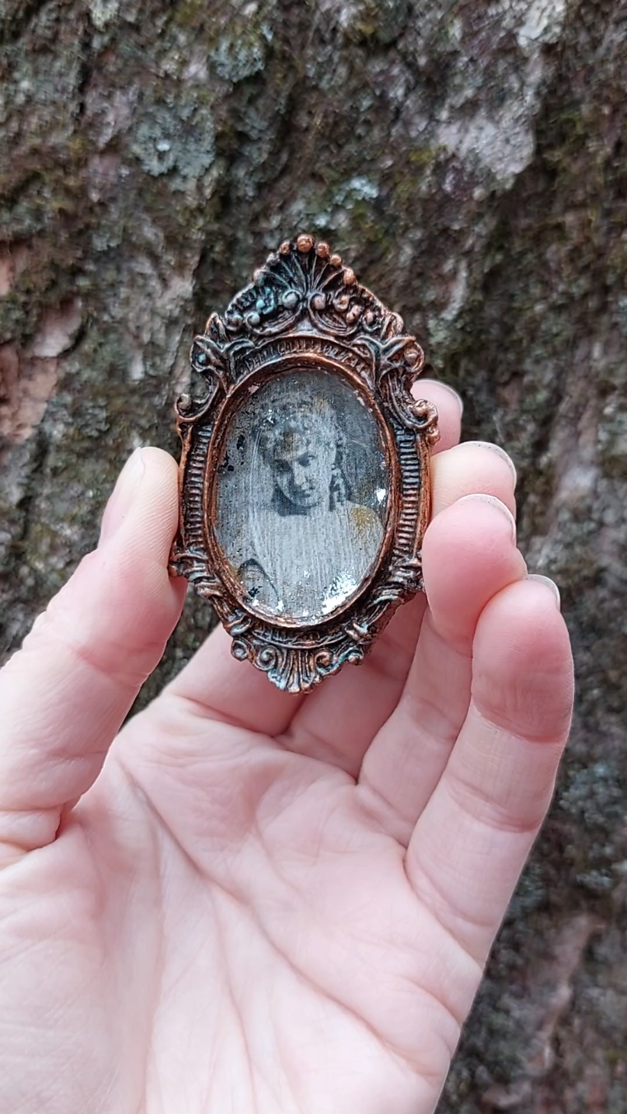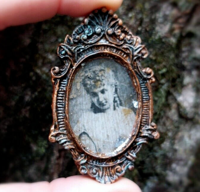 - decorative art brooch - handmade, hand-painted, one-of-a-kind - around 2.25 x 1.5 inches - fiberclay, acrylic paint, silverleaf, epoxy resin, metal pin mechanism - comes in a silk pouch as shown - unique, collectible item directly from the artist This faux vintage one of a kind handmade brooch is made of lightweight fiberclay painted to imitate distressed bronze finish. The piece features an image of a mysterious Victorian lady which was recycled from a used book. Romantic, nostalgic and exquisite, it is a perfect unique art gift for any occasion!
