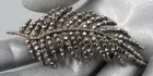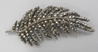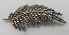 Victorian leaf brooch. Textured, antique silver tone metal set with marcasite and black glass chatons. Rolling safety clasp. About 2.75" by 1.25". This pin is being stored in my pet and smoke-free studio. It will be protectively wrapped and shipped in a box .