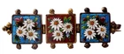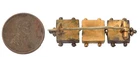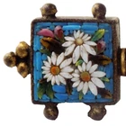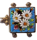 This lovely little Victorian mosaic pin is small - just 1 1/2 inches long and just under 1/2 inch high. It has 3 little squares of mosaic bouquets with daisies. Thought the panels are small, the work is very detailed There are no missing tiles, but some of the white daisy petals have small dark cracks, The setting is brass with a goldtone finish. The little knobs of metal around the mosaic panels are typical of the Etruscan revival style. The goldtone finish is worn, and some of the little metal balls are roughy cast. The pin shaft is slightly bent.The brooch is so small, however, that the flaws in the tiles and the setting are not noticeable when worn.