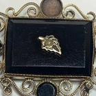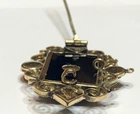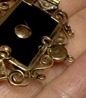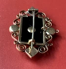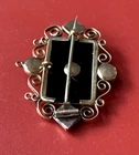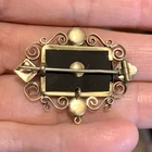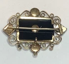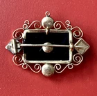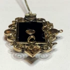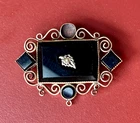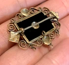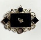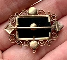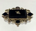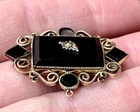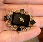1880's Black Onyx or French Jet Mourning Pin w/ Applied Leaf & Seed Pearl center. The stones are beveled and set in either gold filled or pinchbeck setting. Measures 1-1/2" x 1-1/8" Missing one of the circular stones otherwise, great condition with minimal wear on the bevel edge of the large stone (it's barely noticeable). C clasp on back and the hinge works fine. Has 3 tiny loops that likely held some dangles. There is also a loop on the back that would have been used to hang a locket with memento inside (mourning). Any of these could be used to attach a nice necklace chain. Shipping via USPS or UPS We pack carefully to ensure a safe arrival!
