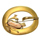 Victorian/Nouveau era sash brooch gilt tone with an oval orange and white art glass stone. C clasp fully functional , only minor discoloration for aging process. Measures 3.25 x 2.5 inches. Beautiful nouveau design. Thanks for looking.