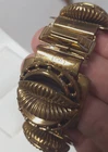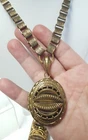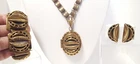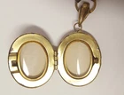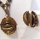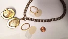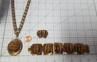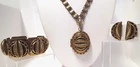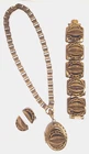 Victorian Revival Book Chain Locket Necklace Bracelet Earrings Vintage Set -pre-owned vintage or antique matched set- locket necklace / bracelet / earrings -possibly signed on the bracelet clasp, CCCO ? -book chain necklace with a photo locket pendant, the inner keeper frames and plastic are in locket -possibly a Pinchbeck style, metal is brassy or bronzy tone gold color closures are - necklace has a fold over bar, bracelet has a box or tab and slot clasp, and earrings are clip-ons - m easures approximately - necklace chain 18" length, pendant including bail- 2-3/4" long -bracelet is 7" long x 1-1/4" wide - earrings are 1-1/8" tall each -shown on a 1" grid mat with a Penny coin and in my hand for size illustration - vintage good condition- minor wear from age and use- bracelet has a discoloration shown in photos -shipped by USPS Ground Advantage Mail, Delivery Confirmation included -buyer pays shipping for returns