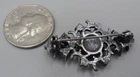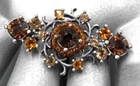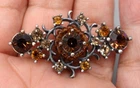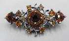 Victorian revival brooch. Marquise-shaped, silver tone filigree set with light and dark topaz brown glass chatons in a variety of sizes. Rolling safety clasp. About 1.5" by 7/8". This pin is being stored in my pet and smoke-free studio. It will be protectively wrapped and shipped in a box .