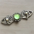 This enchanting vintage brooch captures the essence of Victorian Revival style. The centerpiece features an opalescent green glass cabochon that shimmers with an ethereal glow. Delicate faux pearls in a silver-toned setting add a touch of elegance and whimsy. The exact maker of this brooch is unknown, but its design elements are reminiscent of Victorian Revival jewelry produced in the mid-20th century (1940s-1970s). This era saw a renewed interest in Victorian design aesthetics, with brooches often featuring gemstones, glass cabochons, and romantic embellishments. Why You'll Love It: Mesmerizing green cabochon: The opalescent glass shimmers with captivating colors, making a lasting impression. Romantic pearls: The faux pearls add a touch of femininity and vintage charm. Victorian Revival design: A timeless piece that evokes a sense of elegance and nostalgia. Versatile style: Can be dressed up for a special occasion or add a touch of sophistication to everyday attire. Please follow our store with over 2000 vintage and antique pieces just like this with new items added daily