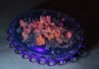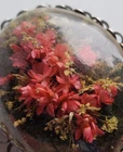 Great vintage brooch with dried flowers inside. Double Layer of Filigree trim around the brooch. Pink flowers glow orange under blacklight. Approximate measurements 1.75" by 1.25" Unknown metal for backing, plastic dome, beautiful dark pink flowers inside with green foliage. Unsigned, unsure of maker or age.