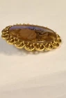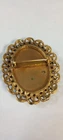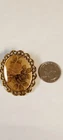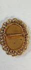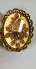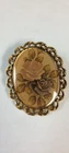 This is an unmarked large Victorian style brooch 2" inches long romantic flower painting covered in a glass bubble with a 10K gold-plated frame and a modern clasp. **** It is in very good condition except for slight wear on the back. it seems to glow from within its iridescent