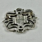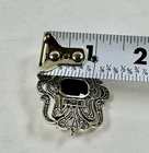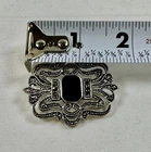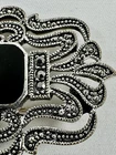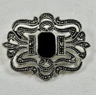 This stunning Victorian style brooch is a must-have for any jewelry collection. The black faux onyx and marcasite details make it a gorgeous accessory for any occasion, whether it be a special event or everyday wear. Measuring at 1.75 inches in length and 1.25 inches in width, this brooch is the perfect size to showcase its beautiful design. Its timeless style makes it a great addition to any wardrobe. A very beautiful piece that has a nice size.