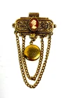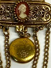The charming, delicate carved cameo in carnelian is set against a victorian style brooch. A center locket with a delicate etching holds two photos. Two chains dangle along side the locket.