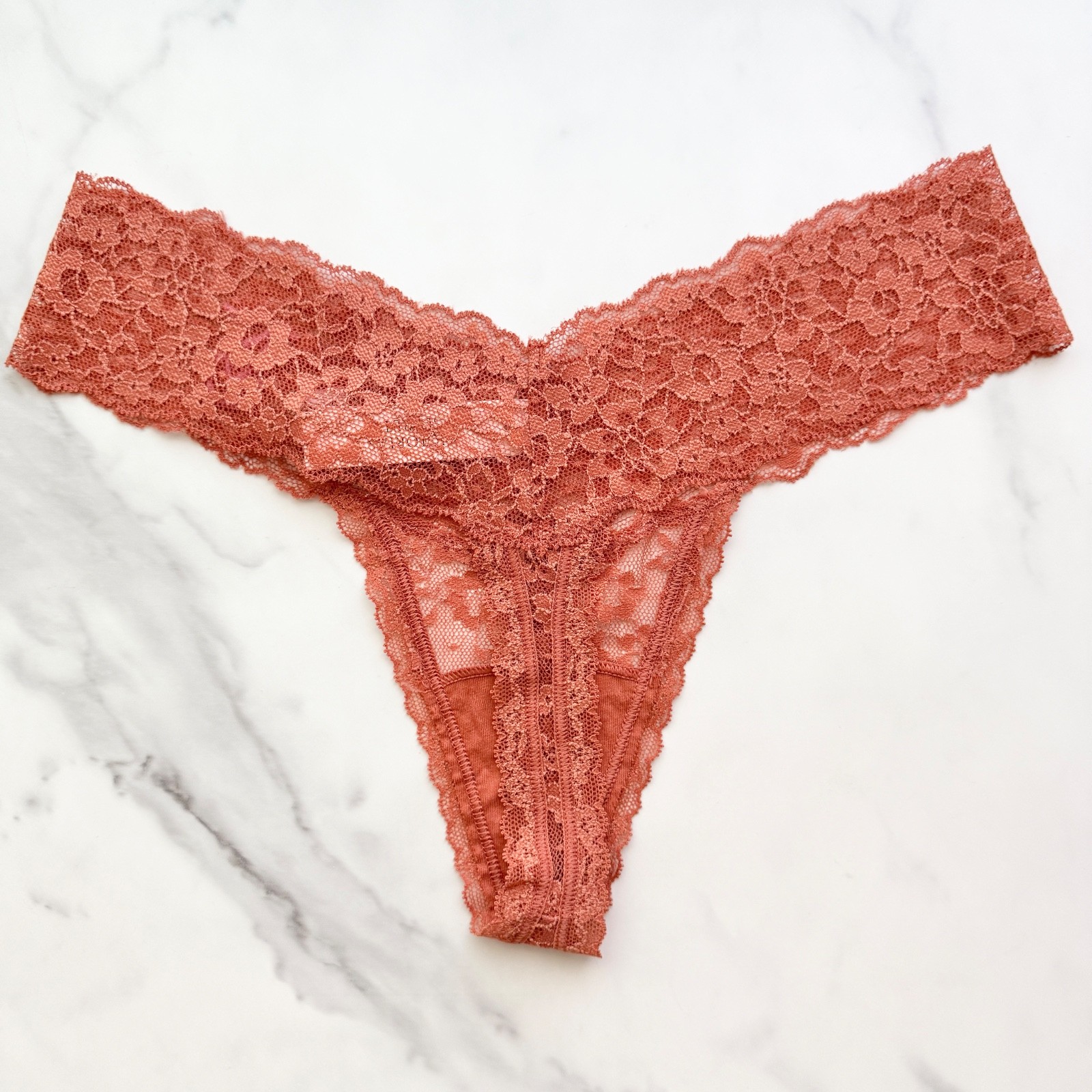 All photos are taken by Goob's Closet & Boutique and may not be reused without permission. This item is listed on multiple platforms and may sell elsewhere without notice. If you're interested, we recommend purchasing now to ensure availability. This panty features a thong style with minimal back coverage and a flattering low-rise fit. The all-over sheer stretch posey floral lace gives it a delicate, beautiful look that stays flat for a no show-through effect, making it perfect for any outfit. Plus, it's made partially from recycled materials, so it's a more sustainable choice. The gusset is made from 100% cotton, ensuring breathability and comfort where it's needed most. Details Thong Style Minimal Back Coverage Low Rise All-Over Sheer Stretch Posey Floral Lace Lace Stays Flat For No Show-Through Made Partially From Recycled Materials 100% Cotton Gusset Style No. 11220020 or 11246161 Color: Gingerbread Color Code (CC): 6BQ0 Material Body: 55% Recycled Polyamide, 35% Polyamide, 10% Elastane Waist: 55% Recycled Polyamide, 31% Polyamide, 14% Elastane Gusset: 100% Cotton Care Machine Wash Measurements Victoria's Secret Size Small (S) will fit US Size 4-6, Waist 26-27 inches, Hips 36.5-37.5 inches best. Victoria's Secret Size Medium (M) will fit US Size 8-10, Waist 28-29 inches, Hips 38.5-39.5 inches best. Victoria's Secret Size Large (L) will fit US Size 12-14, Waist 30.5-32 inches, Hips 41-42.5 inches best. Victoria's Secret Size Extra Large (XL) will fit US Size 16-18, Waist 34-36 inches, Hips 44.5-46.5 inches best. Mannequin Mannequin is shown wearing a size Small (S). Mannequin measurements are: Bust 34 inches, Waist 25 inches, Hips 34 inches.