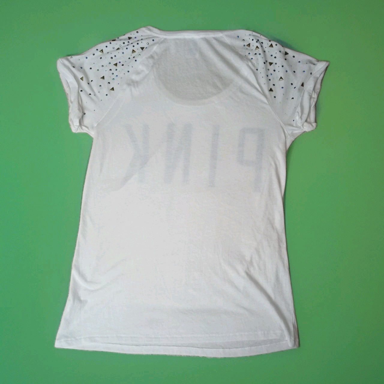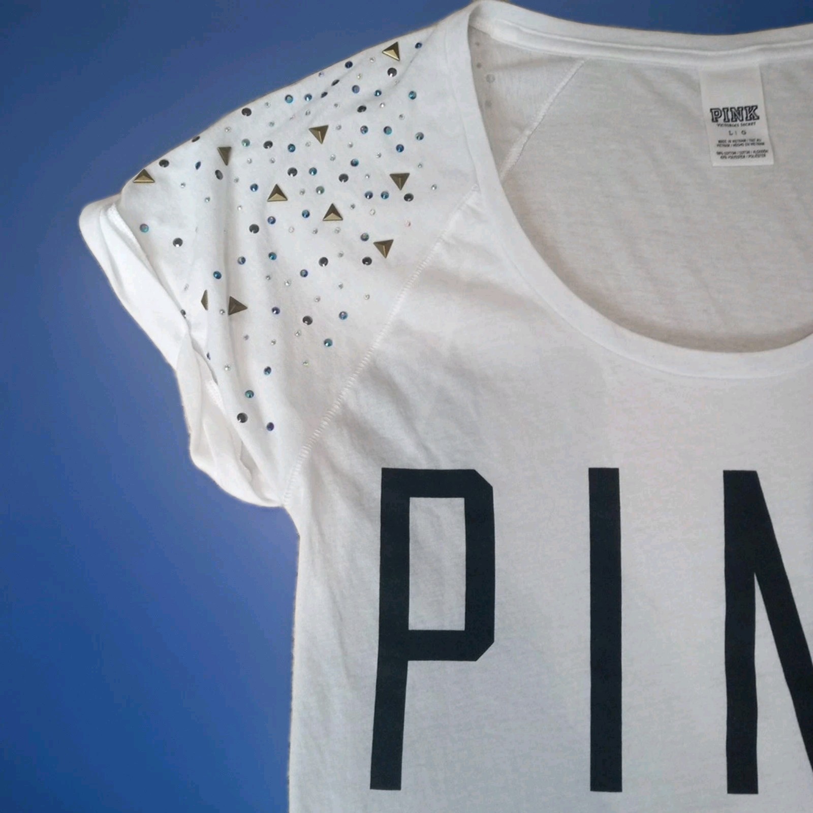 The Victoria's Secret Pink Bling Rhinestone Scoop Neck T-Shirt with Roll Tab Sleeve in size Large is a stylish and eye-catching top designed for women. The pink color and rhinestone accents add a fun and feminine touch to the classic scoop neck and roll tab sleeve design. Made by the well-known brand Victoria's Secret, this t-shirt is sure to be a popular and trendy addition to any woman's wardrobe.