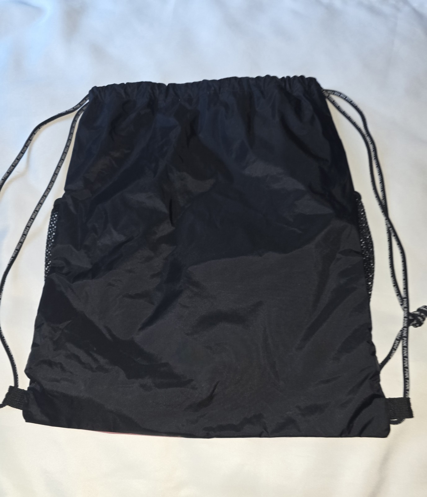 Bag Height:17inStyle:BackpackTheme:School, BeachOccasion:Travel, CasualShape:RectangleCountry/Region of Manufacture:ChinaHandle/Strap Material:PolyesterSize:MediumHandmade:NoProduct Line:Victoria Secret Love PinkHandle/Strap Color:Black with PINK logo name printedPattern:LogoDepartment:WomenBag Width:14 inFeatures:Lightweight, Adjustable StrapClosure:DrawstringBrand:VictoriaLining Color:BlackExterior Color:Pink & BlackLining Material:NylonAccents:Strap Accent, LogoExterior Material:Nylon