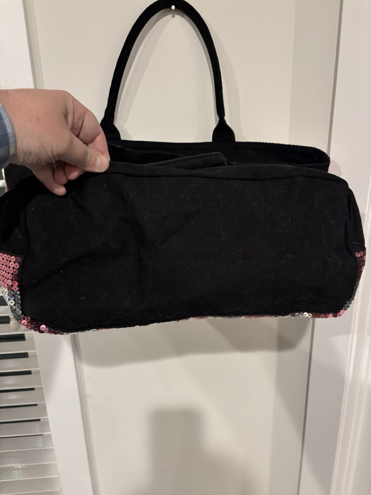This Victoria’s Secret Gym Duffle Tote Bag is the perfect accessory for any active woman. With its black, pink and gray exterior color and sequin accents, it adds a touch of glamour to any workout or casual outfit. The cotton exterior material is durable and easy to clean, while the gray lining and pink hardware add a pop of color. The duffle is spacious enough to hold all of your gym essentials and the gray handle/strap color provides a comfortable grip. Whether you're heading to the gym or running errands, this bag is a must-have for any stylish woman.