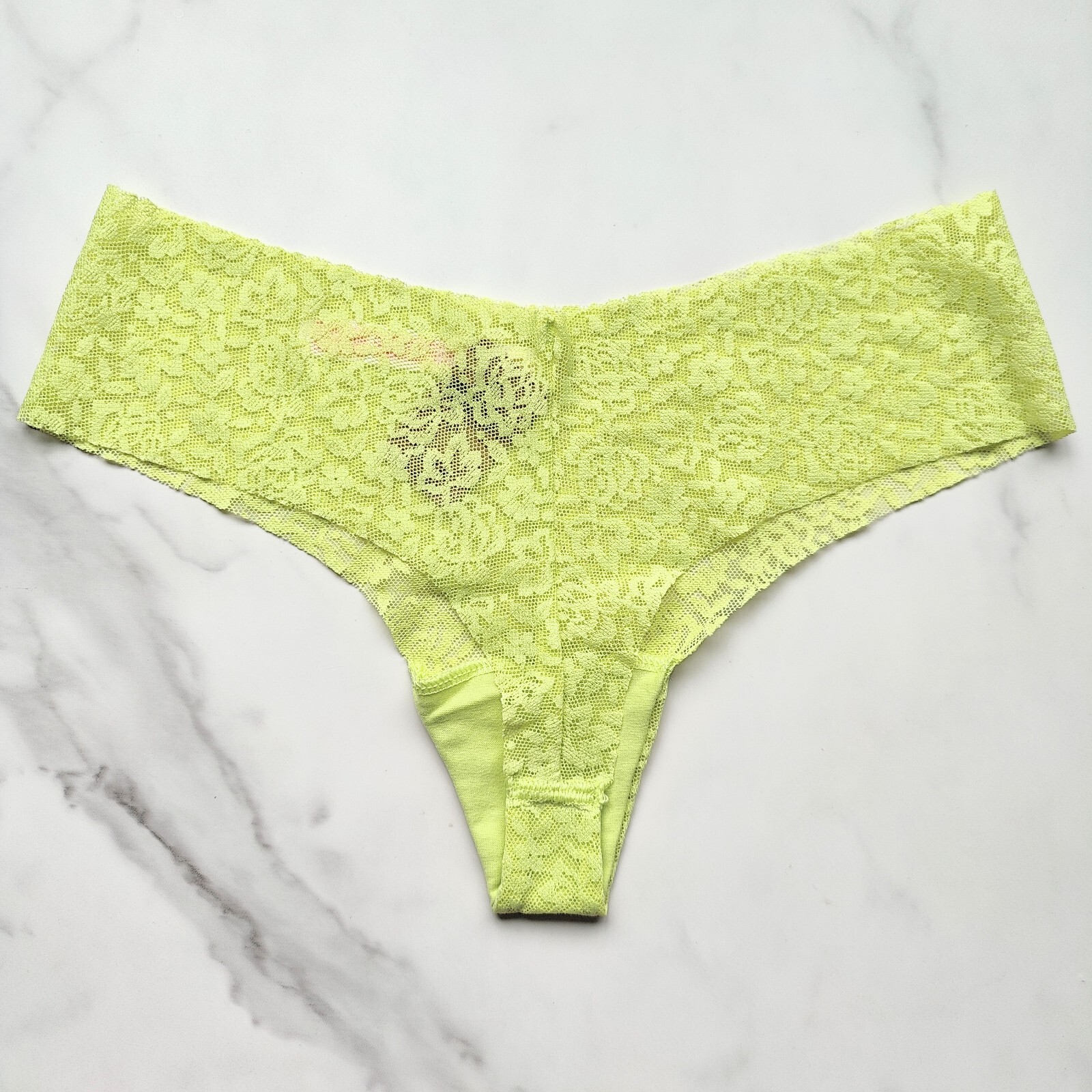 All photos taken by Goob's Closet & Boutique and may not be reused without permission. This thong style panty provides minimal back coverage and a low rise, making it an ideal choice for those who prefer no-show lines. Crafted from soft, breathable floral lace, it ensures a comfortable and light feel. Designed with 4-way stretch fabric, this panty moves with your body, offering flexibility and comfort throughout the day. The raw-cut edges create a smooth, no-show look, eliminating any visible panty lines for a flawless finish under clothes. Additionally, it’s made partially from recycled materials, combining eco-consciousness with modern style. Details Thong Style Minimal Back Coverage Low Rise No-Show Floral Lace Body No Panty Lines 4 Way Stretch Fabric Breathable Raw-Cut Edges Made Partially From Recycled Materials Style No. 11207398 Color: Green Spring Color Code (CC): 5KI2 Material Body: 42% Recycled Polyamide, 38% Polyamide, 20% Elastane Gusset: 91% Cotton, 9% Elastane Care Machine Wash Measurements PINK Victoria's Secret Size Small (S) will fit US Size 4-6, Waist 26-27 inches, Hips 36.5-37.5 inches best. PINK Victoria's Secret Size Medium (M) will fit US Size 8-10, Waist 28-29 inches, Hips 38.5-39.5 inches best. PINK Victoria's Secret Size Large (L) will fit US Size 12-14, Waist 30.5-32 inches, Hips 41-42.5 inches best. PINK Victoria's Secret Size Extra Large (XL) will fit US Size 16-18, Waist 34-36 inches, Hips 44.5-46.5 inches best.