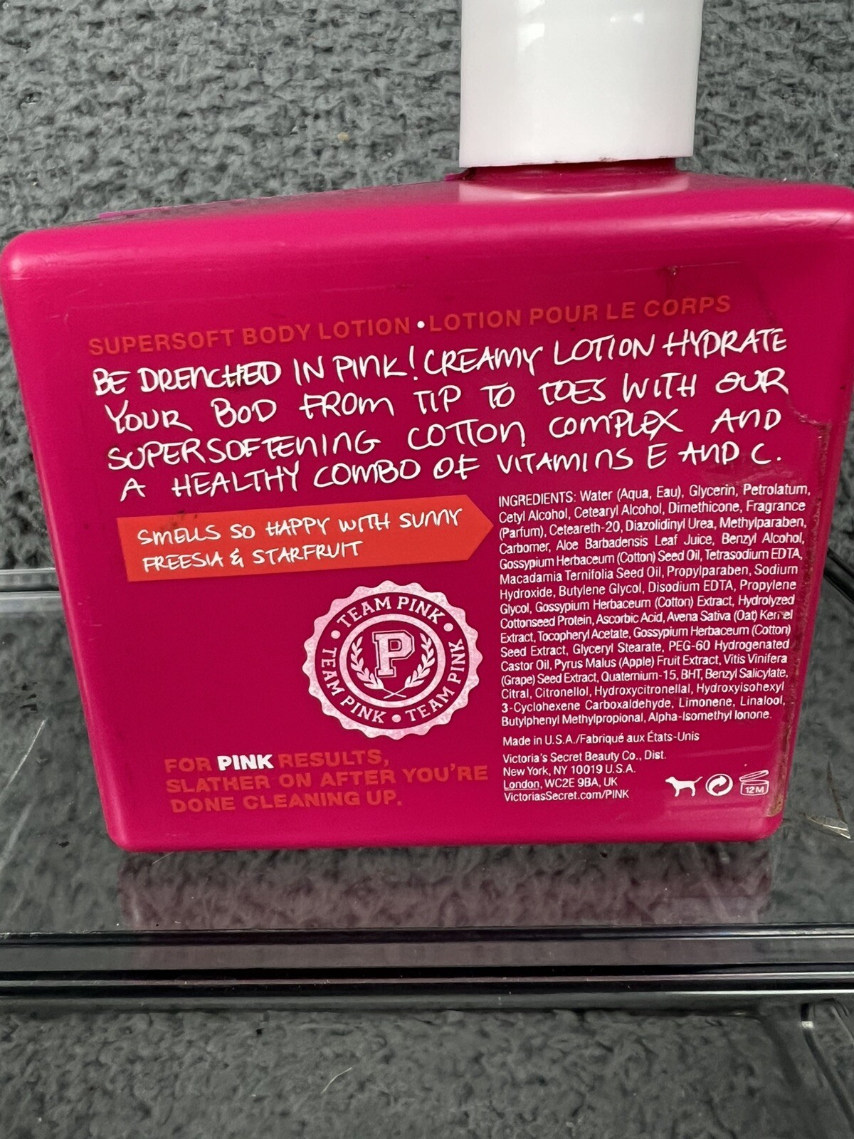 Victoria's Secret Pink SUNNY & HAPPY Drenched Pink Body Lotion 16.9 Oz 95% FULL. Sticker on the front of lotion, is a little crooked from being stored. The lotion is 95% FULL