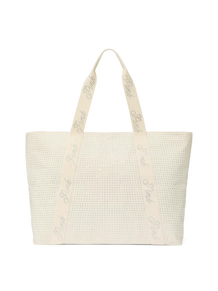 The Victoria's Secret Pink White Rhinestone Bling Large Tote Bag is a stylish and spacious rectangular tote designed for everyday use. This bag features a zip closure, double white handles, and white rhinestone accents, adding a touch of glamour to your outfit. Made from durable polyester with a white canvas handle/strap material, this tote is perfect for carrying all your essentials in style. Show off your love for Victoria's Secret with this chic and versatile accessory.