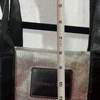 This Victoria's Secret Large Tote Bag is a stylish and practical accessory for any occasion. With a rectangular shape and double handles, this tote is perfect for carrying all your essentials. The bag features a zip closure and black hardware accents with the Victoria's Secret logo. The exterior is made of durable polyethylene material and the lining is made of polyester. This tote is perfect for travel, parties, and casual outings. The metallic silver and black color combination is versatile and chic. The bag has a size of Large and has a unit quantity of 1. The handle drop is 8 inches and the strap drop is also 8 inches. This tote is part of the Victoria Secret Weekender product line and has features such as a zipper. The tote is not handmade and has no vintage or personalized aspects.