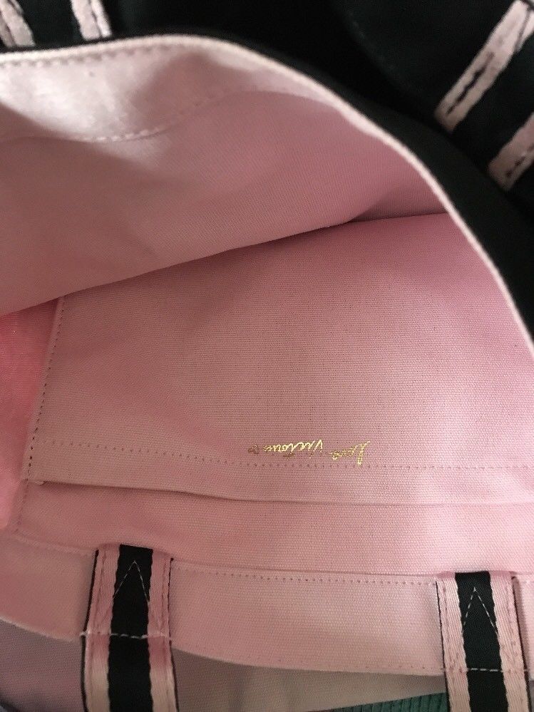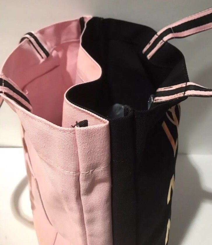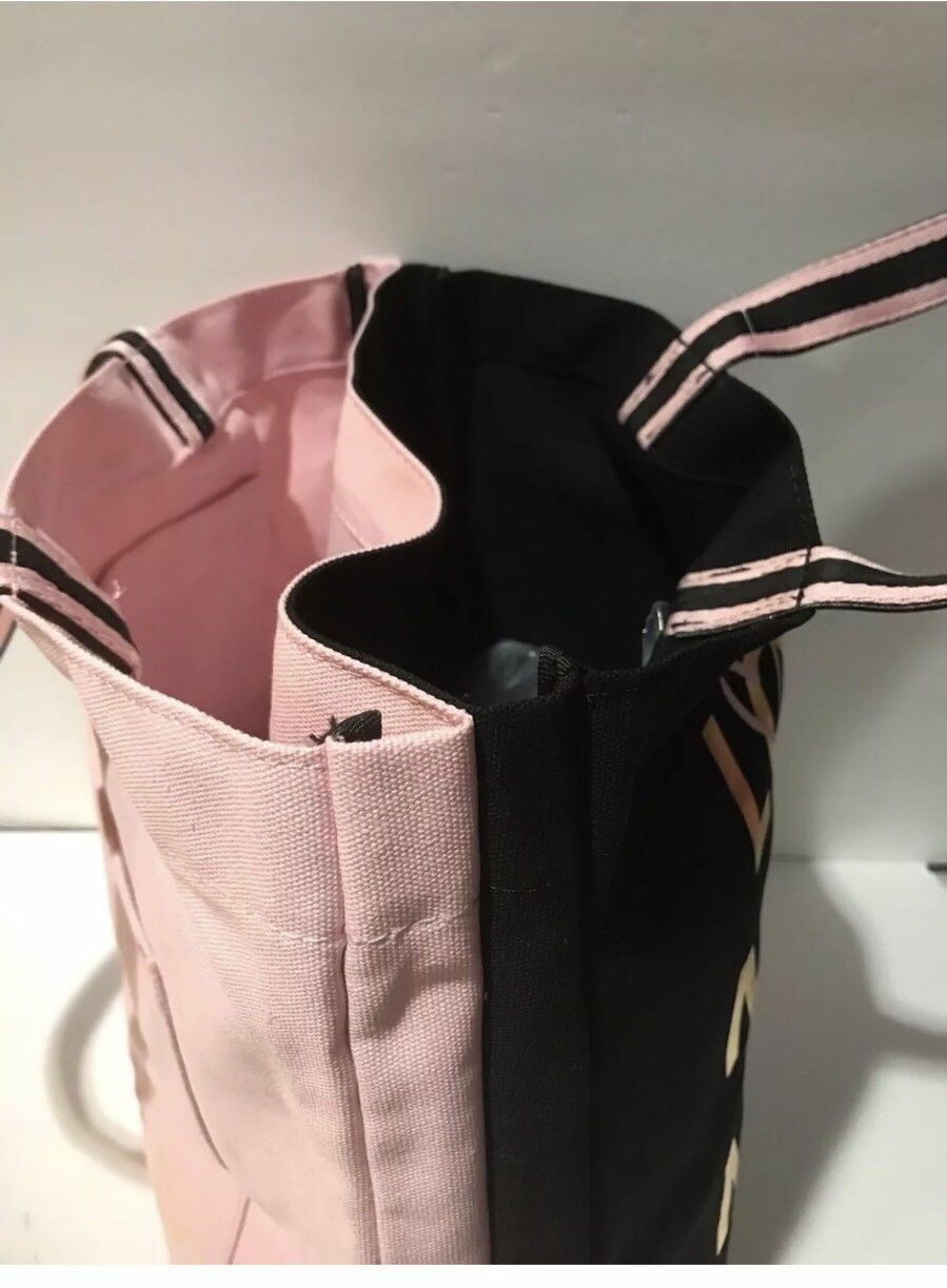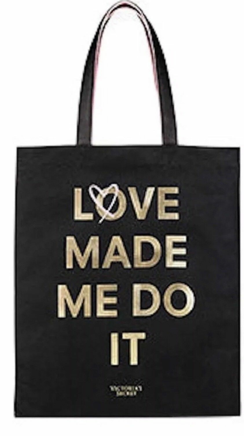 VICTORIA'S SECRET BLACK/PINK COTTON & CANVAS "LOVE MADE ME DO IT" LARGE CARRY-ALL TOTE BAG DETAILS: 100% AUTHENTIC Approximate Tote Measurements; 16.75"H x 14"W x 2"D x 9" Duo Strap Drop. 2 Interior Compartments With Signature Heart Detail 1 Large Interior Pocket