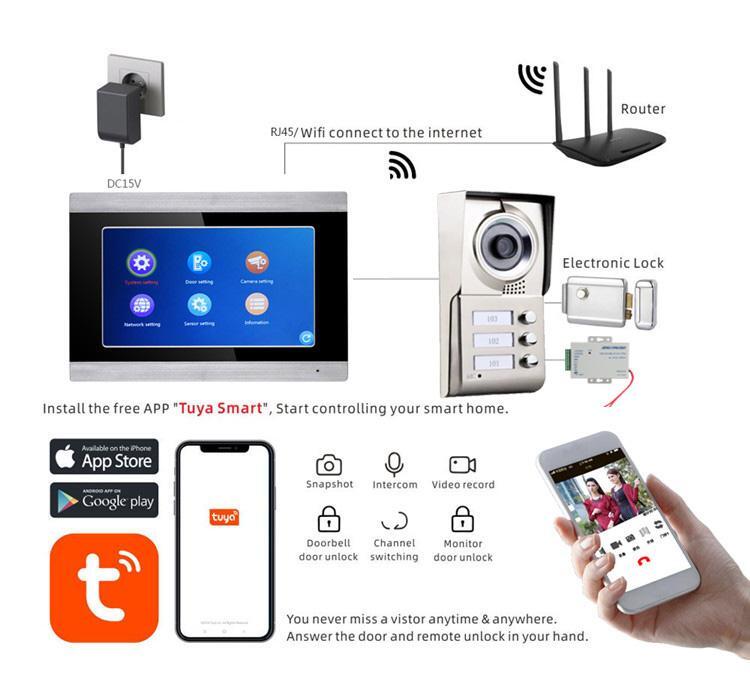 Video Doorbell Intercom TUYA App Control WIFI 7" monitor Motion detection Alarm TUYA Video Intercom WIFI Video Door Phone System Home Intercom with 7 Inch Support Remote APP unlocking, Recording Products Introduction: Easy installation by yourself with the adapter and cable we provided in this kit,outdoor unit can connect to indoor monitor by wired 4P cable. When indoor monitor connected to your wireless wifi router or wired network cable,you can connect mobile phone to indoor monitor,then mobile phone also can record video or open the door etc. Widely used in villas, apartments, houses, hotels, offices, public buildings and so on. 1. 7 inch full touch screen monitor , supports 2 doorbells, 2. Real-time control by smart phone , unlock , 2 way talk , snapshot , recording 3. supports TUYA Smart APP 4. monitor system supports English / русский / français / Español / Deutsch / Italiano 5. supports motion detection, videos record to memory card 6. motion recording time 10s -300s 7. supports messages push to smart phone (visitor pressing call button / motion detection) 8. supports adjust doorbell volume / monitor volume / ringtones separately , monitor has 10 ringtones 9. supports clock mode 10. maximum supports 6 monitors connected (1 master monitor + 5 slave monitors) 11. monitor connect to doorbell by 4 Pin cables , monitor connect to network by WIFI 12. The indoor monitor can support to connect 5 mobile phone APP user,Support IOS/Android system mobile phone , then the mobile phone can view and unlock. 13.Anti-oxidation and wear-resistant outdoor unit, with a rain-cover, wall installation more convenient. 14.Outdoor unit use AHD 720P camera 15.Can connect to NO electric lock directly,with unlock delay setting. 16.Come with power supply & terminal wire,user can install by themselves. Features: Indoor Monitor: Display:7inch IPS (16:9) Resolution: 1024(H)X600(V) Unlock: Support mobile phone and tablet to unlock Additional memory: Support additional TF card (8G Include 32GB max.) Touch : Yes Wifi: Yes RJ45:Yes Power supply: DC15V Installation: Surface mount Size:200*140*19mm Outdoor Unit: Model No. :MC Night Vision:IR lights, visible within 3 meters Vision Angle:92 º Wide Angle Resolution:> 1000TV Line Plus Control:Automatically Power Consumption:Standby: 0.1W; Unlocking: 6W Installation: Embedded mounted Size:180*95*25mm Material: Aluminum alloy Accessory: 1*Indoor Monitor 1*Outdoor Unit 1*15V Power Supply 1*4-core terminal wire (5m) 1*RJ45 terminal wire 1*unlock terminal wire 1*Manual 1*Mounting plate 1*Screws *We only accept paypal payment . Please make payment within 3 days. *Please ensure the address you registered on PayPal is correct , if you want to change your shipping address, please email us in time. We are not responsible for wrong or undeliverable address. *Import duties, taxes and charges are not included in the item price or shipping charges. These charges are the buyer responsibility. * Please check with your country customs office to determine what these additional costs will be prior to bidding/buying. If the product exceeds 2KG, we will ship by DHL/EMS/TNT/Fedex and so on. Depending on the DHL /EMS/TNT /Fedex shipping cost in different countries, if the shipping cost is too high, we will charge extra shipping cost difference. Because the shipping cost are expensive than before, we will change your shipping cose if your address too remote, there is remote surcharge, such as below USA address: Puerto Rico and Virgin Islands: ZIP codes starting with 006-009 Hawaii and Guam: the first 3 digits starting with 967-969 Alaska: the first three digits starting with 995-999 Military address: the city is APO, FPO, DPO To worldwide via China Hongkong Post Airmail . Estimated shipping time: Country Shipping Method Shipping Time USA ePacket from China 10~15 Days Others (For buyer from outside USA) Economy shipping from overseas. If your package over than US$20 , Free Insurance with Tracking Number! If your package value lower than $20,It will be sent via flat mail and no track number. Or You can contract me to pay extra money for registered fee and track number. 15~30 Days **** Sales Promotion: If the total amount of your order is more than 2KG.Your orders will be sent by Express delivery(Maybe DHL, Fedex, or EMS/TNT), It usually take up 4-10 working days to arrive. We will ship the item within 2 days after receipt payment (except Saturday and Sunday) . Pleased be advised that international usually take longer than domestic,as it's based on shipping service provider and customs. If you cannot get within 20 days since we ship out, please email us, we will check the item status for you. NOTE: we are not responsible for customs tax and the customs clearance when the item arrive to destination, hope you understaning. eBay Cross Border Trade powered by ChannelEffect