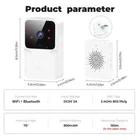 Features: Long Standby: No disassembly cycle charging. Built-in lithium-ion high-capacity battery, long standby. The doorbell is powered by built-in large battery, no need to charge frequently; and the chime is of USB power supply, easy and convenient for use. Video Call: Easy to deal with visiting guests, when someone presses the doorbell, the doorbell will push notification to the phone, and the owner can enter the phone video conversation interface. Portable Installation: Can be pasted and perforated. Support adhesive backing, no need to punch holes, while supporting hole punch installation. No plugging, convenient and hassle-free. Capture Screen: Storage to the cloud, security protection drip. When a visitor presses the doorbell, it can capture the visitor's picture and save the record to the cloud, so that the cell phone APP can view the past pictures at any time, which is safer and more secure. Wireless Video Doorbell Camera: Support 2.4G WiFi and APP connection, 480P high resolution, presenting you clearer pictures & videos and more details. 2-Way Audio: With built-in mic, you can see and talk to your visitors at anytime and anywhere. Night Vision: Built-in high-quality IR LED lamp beads and light sensor, the picture is clear at night; also can automatically switch to night mode from day mode after the ambient light drops down to 2 Lux. Strong and stable signal, easy to pair up, transmission range up to 50 meters, ring tones and volume can be adjusted according your preference. Specification: Name: Smart Doorbell Material: ABS Plastic Electronic Components Color: White Max. Resolution: VGA, 640*480 Video Coding Standard: MJEPG Audio Coding Standard: G711.A Video Frame Rate: VGA@20fps Day/ Night Mode Switch: Automatic Video Transmission Encryption: AES Radio Frequency Coding: EV1527 Infrared Lamp Control: Automatic, Adjustable Sensitivity Infrared Lamp Wave Length: 850nm Motion Detection: Automatic, Adjustable Aensitivity Connection Mode: 2.4G WiFi Working Temperature: -10~45℃ Working Humidity: ≤95% Doorbell Battery Capacity: 1000mAh Package list: 1*Smart Doorbell (Include Lithium battery inside) 1*Usb Cable 1*User Manual 1*Some Screws