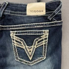 Vigoss bootcut jeans in a dark wash feature heavy contrast stitching and intricate embroidery on the pockets for a bold, Western-inspired look. These mid-rise denim pants are designed with a classic five-pocket styling, including rhinestone-embellished rivets and a double-button waist closure. The whiskering and fading through the thighs add a lived-in feel, while the thick decorative stitching defines the seams and back pocket "V" design. Measurements: • Waist: 18.5" (37" doubled) • Inseam: 30" • Rise: 10" • Leg Opening: 9.5" Brand: Vigoss Style: Bootcut Color: Dark Wash Blue Material: Denim Closure: Double Button Zip Fly Pockets: 5-Pocket Design Stitching: Heavy Contrast Detailing: Rhinestone Rivets Embroidery: Back Pocket V-Logo Rise: Mid Rise Fit: Regular Wash: Whiskered & Faded Keywords: Western, Cowgirl, Rodeo, Thick Stitch, Y2K, Embellished, Bling, Dark Denim, Bootleg, Boho, Country, Glam, Casual, Classic Denim Follow us for great deals! -- New items listed daily! -- We ship daily!