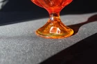The Viking Epic Amberina Swung Glass Handkerchief Vase is a stunning piece of Mid-Century Modern art glass. Standing at 7.5 inches tall, this vase features a unique 6 petal pedestal design in a vibrant orange color, typical of the Amberina glass style. Hand-blown in the United States during the 1960s, this abstract art piece by Epic is a beautiful representation of the era's artistic style and craftsmanship. Perfect for collectors of vintage glassware or those looking to add a touch of retro beauty to their home decor.