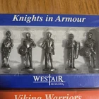 This vintage miniature set by Westair features four detailed pewter figurines of Viking Warriors in armor. Each figure measures 1.5 inches in height and is part of a 1990 collection, making them a unique addition for collectors or historical enthusiasts. The pewter material and intricate design showcase the craftsmanship of these miniature models, which are suitable for ages 3 and up. Made in the United Kingdom, these figures offer a glimpse into the world of militaria and the era of Viking warriors.