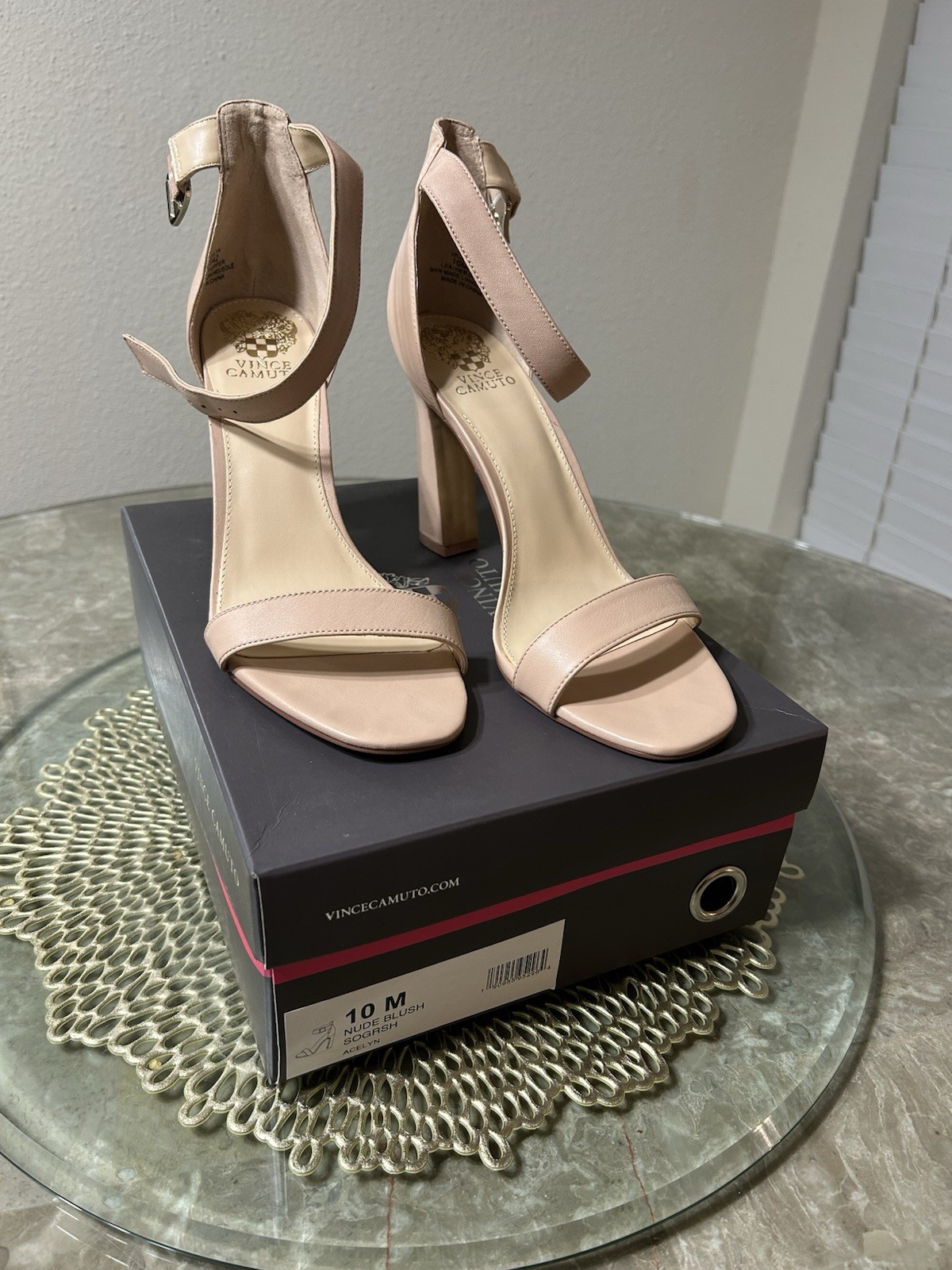 The product is a pair of stylish Vince Camuto Acelyn Nude Blush Leather Ankle Strap Block Heel Sandals in size US 10M. Featuring a nude blush color and a 4”block heel, these strappy sandals are made of leather and are perfect for the summer season. This designer footwear from Vince Camuto combines fashion and comfort, making it a versatile option for any woman's wardrobe.