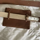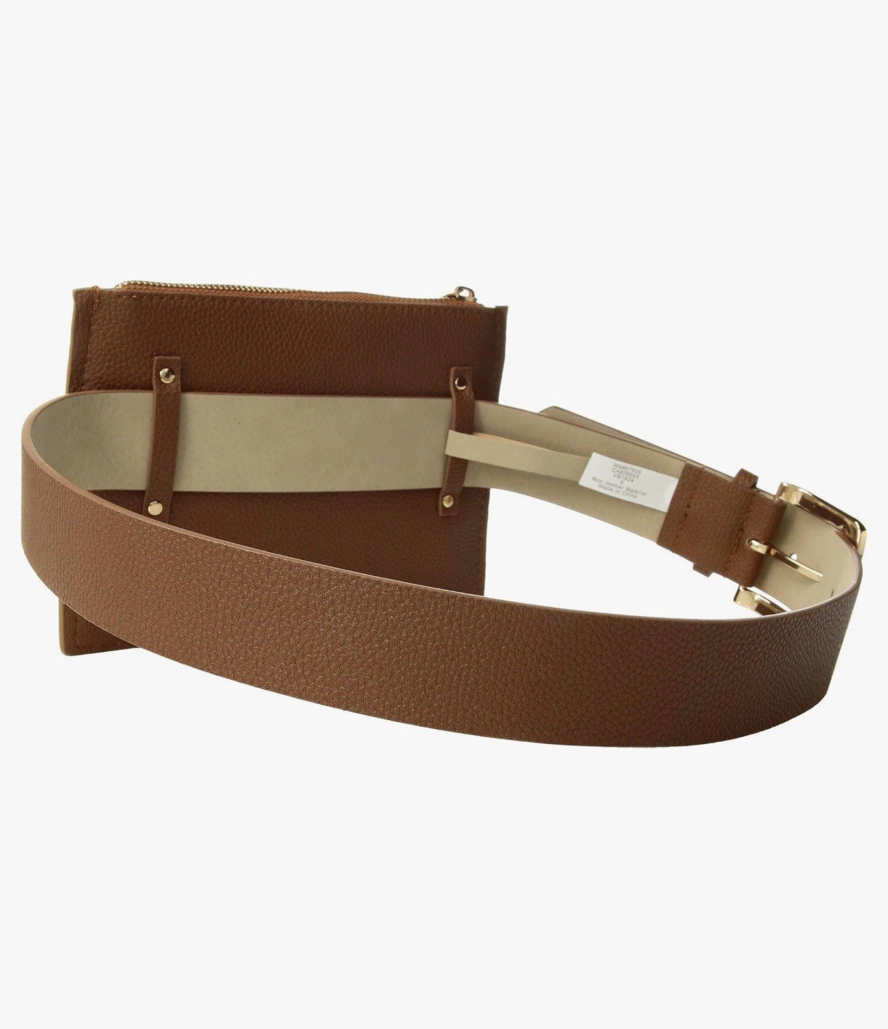 The Vince Camuto Double Pocket Belt Bag in Cognac Brown is a stylish and practical accessory for women. Made from faux leather with a pebbled finish, this medium-sized rectangular bag features a zip closure and a brown leather handle/strap. It includes adjustable straps, pockets, and gold hardware, making it a functional and fashionable choice for on-the-go use. The solid brown exterior color and the reputable Vince Camuto brand add a touch of sophistication to this belt bag, perfect for everyday use or special occasions.