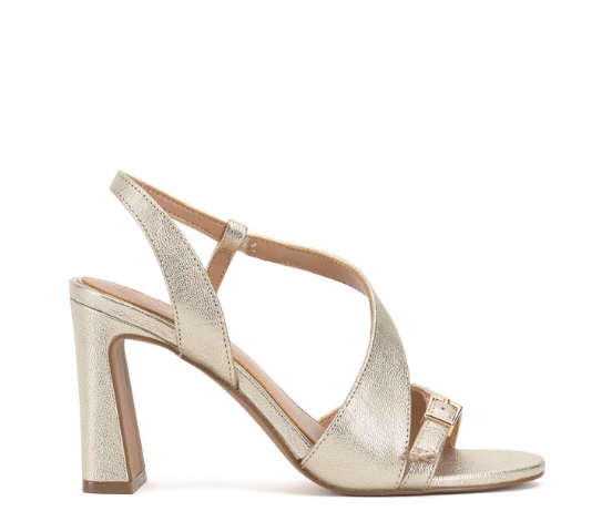 Vince Camuto Adesie Sandals, Gold Metallic, Size 9 M Authentic Guaranteed Asymmetric vamp straps lend modern dimension to a stylish slingback sandal grounded by a cushioned footbed and flared block heel. 3" heel