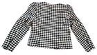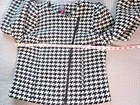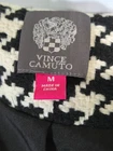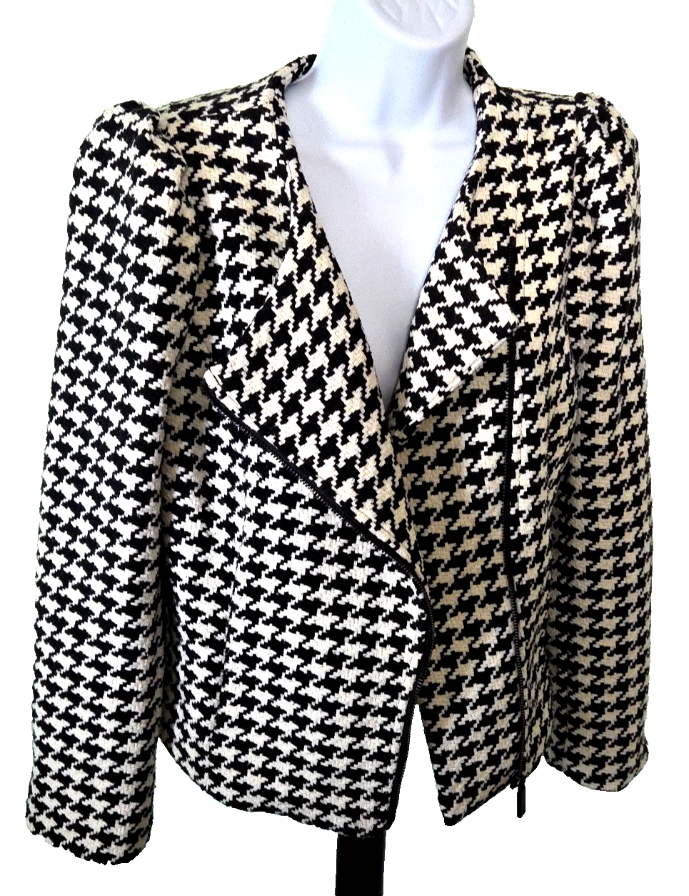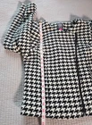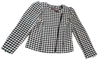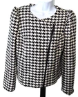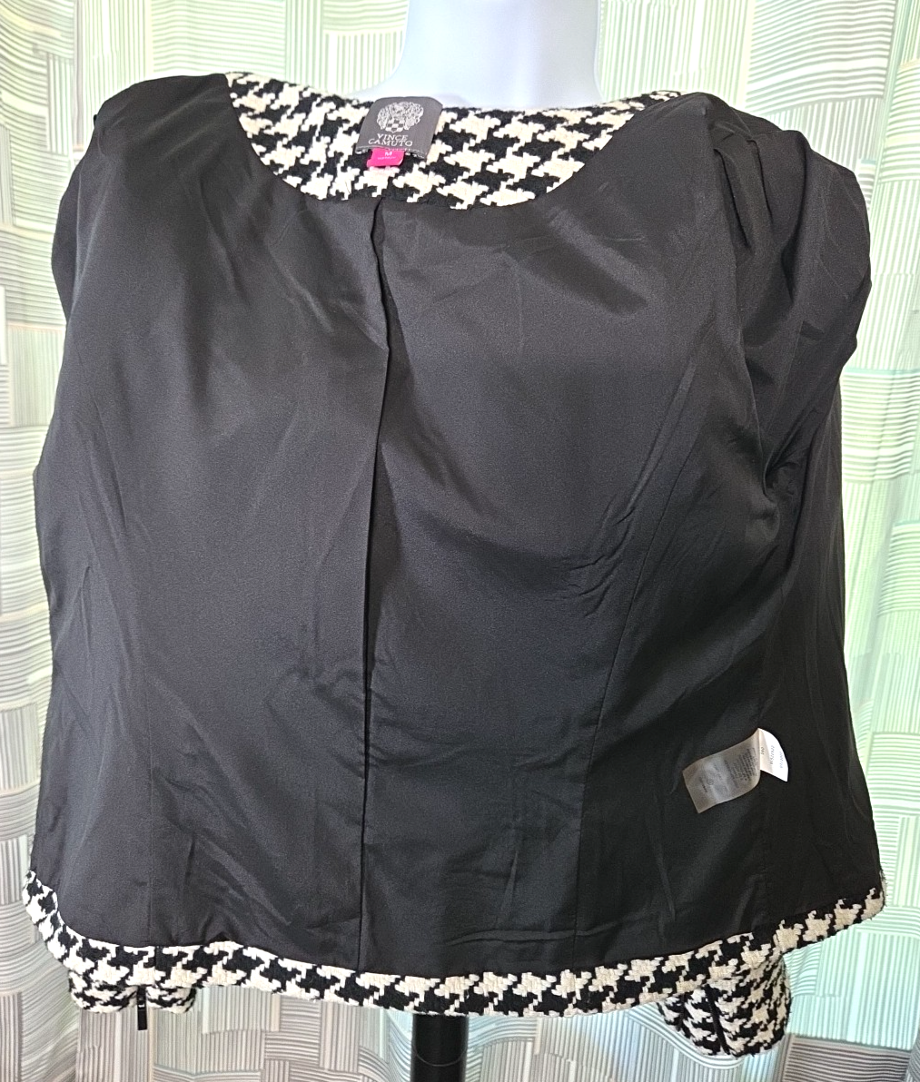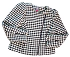 The Vince Camuto Houndstooth Jacket is a stylish and versatile jacket for women in size Medium. Made from a blend of Polyester, Acrylic, Viscose, Polyamide, Cotton, and Wool. T his short-length jacket features a classic houndstooth pattern in black and white colors. It has long sleeves and a asymmetrical full zip closure, making it suitable for casual, workwear, and business occasions. The jacket is lined with polyester for added comfort and warmth, and it showcases subtle accents with a zipper on the sleeve and an asymmetrical design. See approximate measurements for the best fit. Approximate measurements of the jacket lying flat: Armpit to armpit 19 - inches Shoulder to bottom front hem 21 - inches