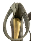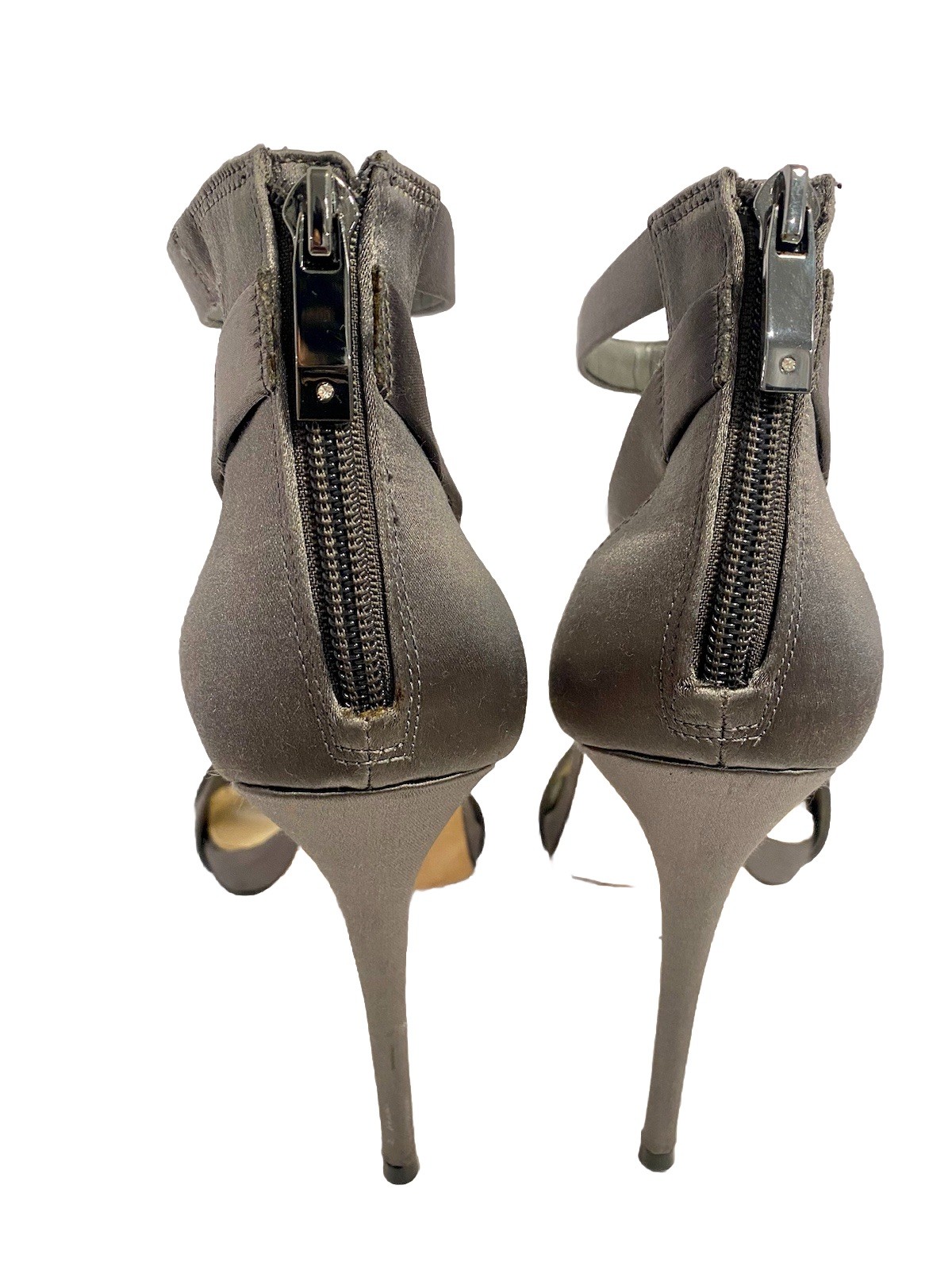 The product is a pair of Vince Camuto heels in a strappy scandal design with a satin gray color and a 4.5" ultra high heel. These stylish heels are perfect for occasions like weddings and parties, and the stiletto heel provides a touch of elegance. Pre-owned. Minimal peeling of the inner aspect of straps. Otherwise very good condition!