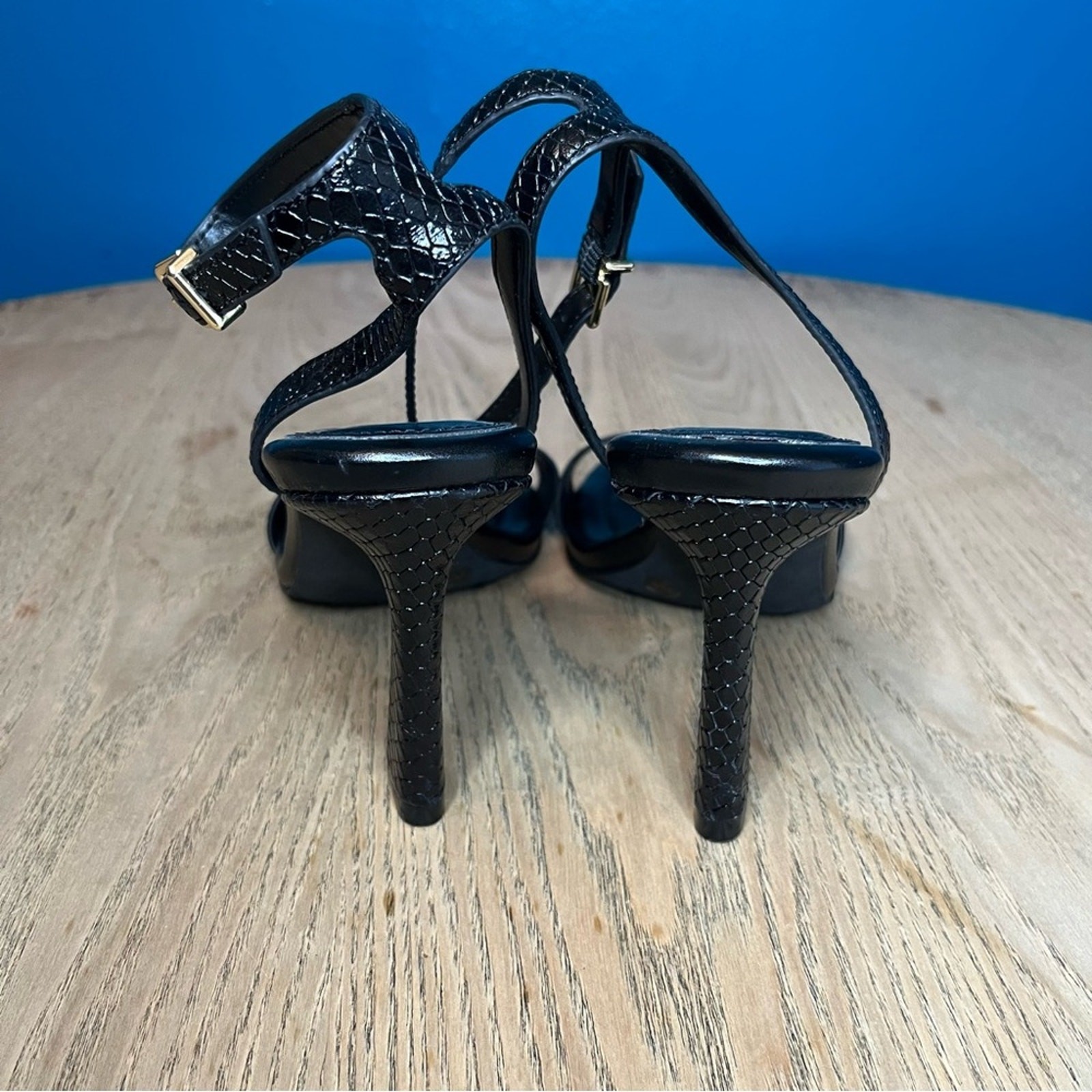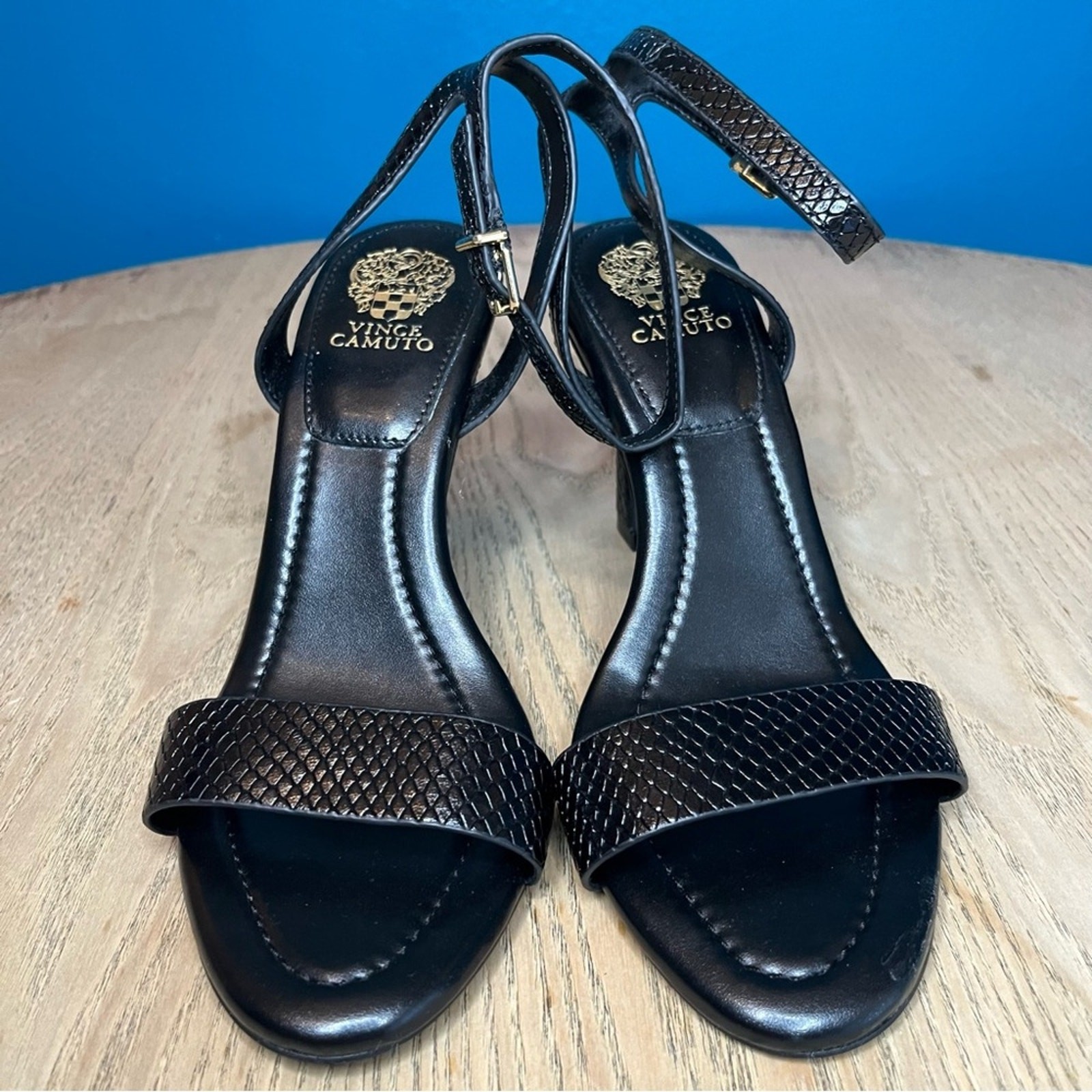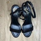 Vince Camuto Penelopy Black Ankle Strap Embossed Leather Heels Polished hardware and a leather upper distinguish a minimalist sandal fitted with an adjustable ankle strap for a secure fit. Women's Size 8 3 1/2" heel Adjustable ankle strap with buckle closure Leather upper/synthetic lining/rubber sole excellent condition Please review all photos!
