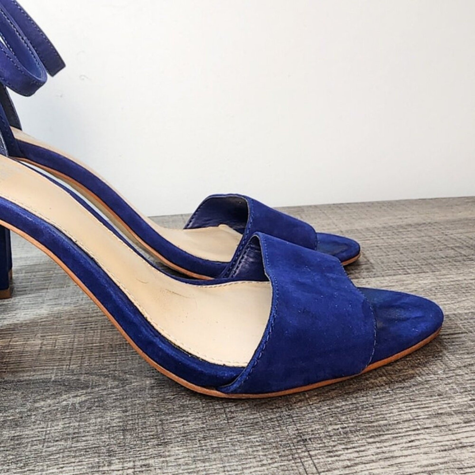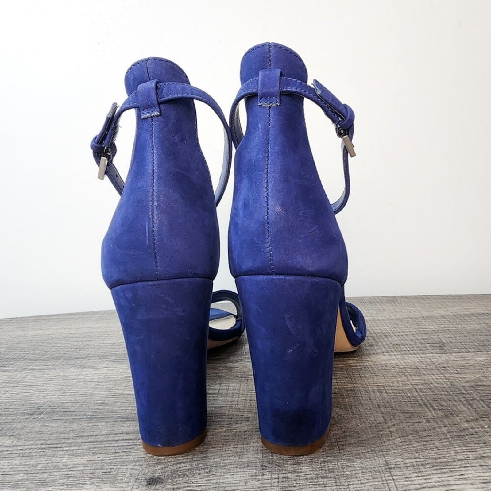 Vince Camuto royal blue suede block heel ankle strap sandals. These stylish sandals feature an open-toe design with a single vamp strap and an adjustable ankle strap with a silver buckle closure. The stacked block heel provides comfortable height and stability, making them perfect for dressing up or down. Ideal for a night out, a summer wedding, or a chic daytime look. Style: Strappy Department: Women Upper Material: Suede Heel Style: Block Type: Heel Toe Shape: Open Toe Pattern: Solid Heel Height: High (3-3.9 in) Closure: Buckle Features: Adjustable Strap, Ankle Strap, Straps Lining Material: Leather Keywords: Vince Camuto heels, suede sandals, block heel sandals, ankle strap heels, royal blue shoes, open toe sandals, evening shoes, wedding guest shoes, summer fashion, dressy sandals, comfortable heels, chic footwear Save on shipping and bundle!