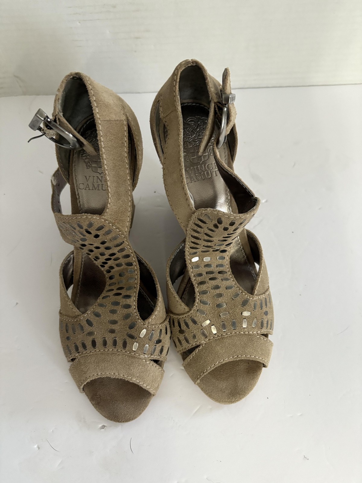Vince Camuto Shoes Womens Size 9 Taupe Suede Wedge Sandals Cutout Peep Toe Buckle Condition: Good pre-owned condition with moderate wear on soles and light signs of use throughout. Some scuffing and light marks may be present, visible in photos. Genuine Vince Camuto branding on insole and outsole Upper: Taupe suede leather with metallic oval cutout details Style: Peep toe, wedge heel, slingback with buckle closure Outsole has Vince Camuto crest embossed pattern and logo at arch Women’s US Size 9 (verify sizing in images) Approximate wedge height: mid-height (see photo for reference) Classic and versatile summer sandal perfect for dressy or casual outfits