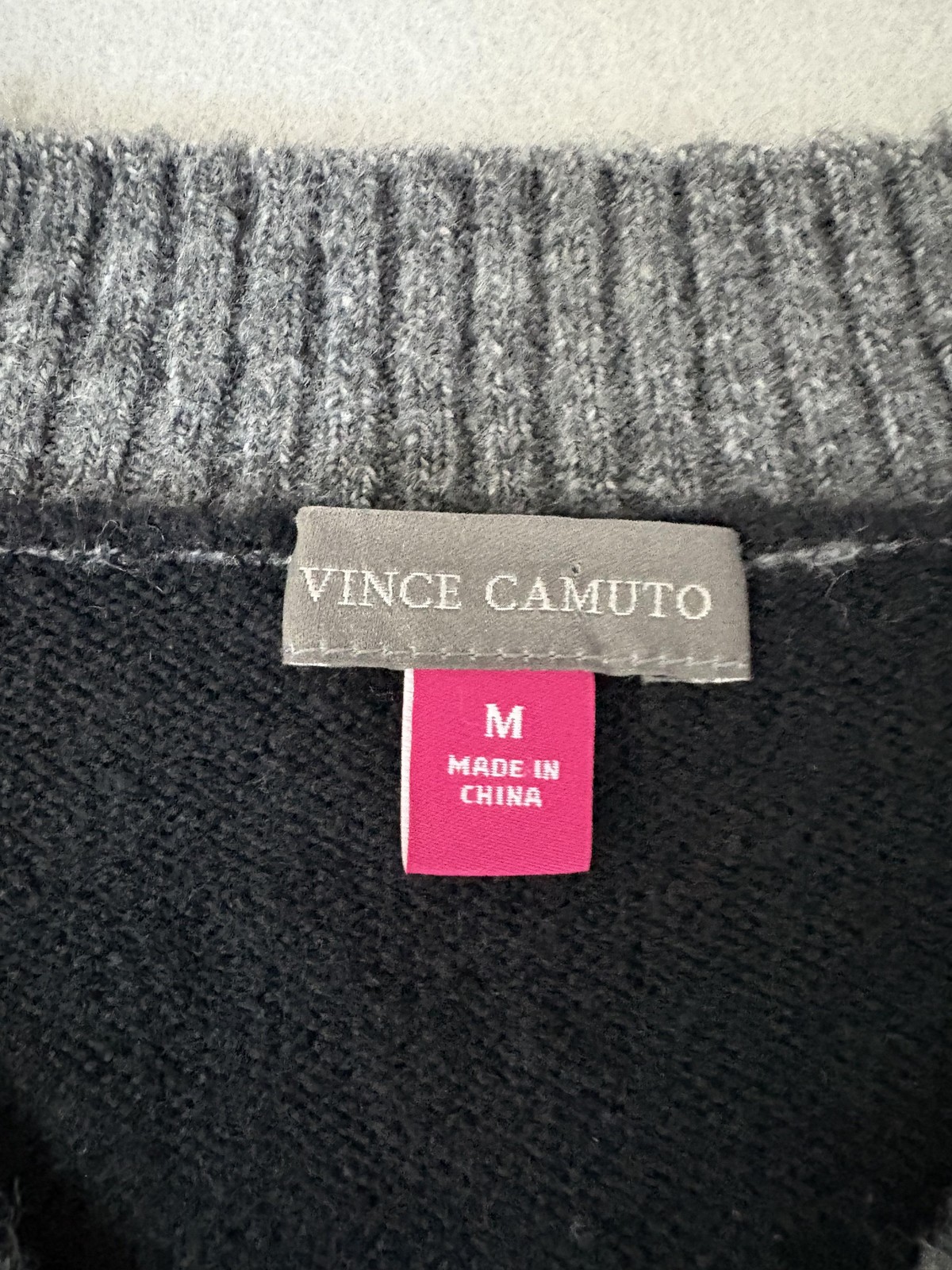 Brand: Vince Camuto Item: Womens V-neck pullover sweater Tag size: Medium Colors: Heather gray front and sleeves with solid black back and hem (colorblock look) Fabric: Acrylic, polyester, and spandex blend as shown on care tag; hand wash cold Country of origin: Made in China (per tag) Design features: V-neck; relaxed silhouette; rib-knit cuffs and wide rib hem; side vents; high-low step hem with layered look Style: Casual knit pullover, soft feel Notes: Care/content tag visible in photos Please compare to a similar sweater for best fit; colors may vary slightly due to lighting.