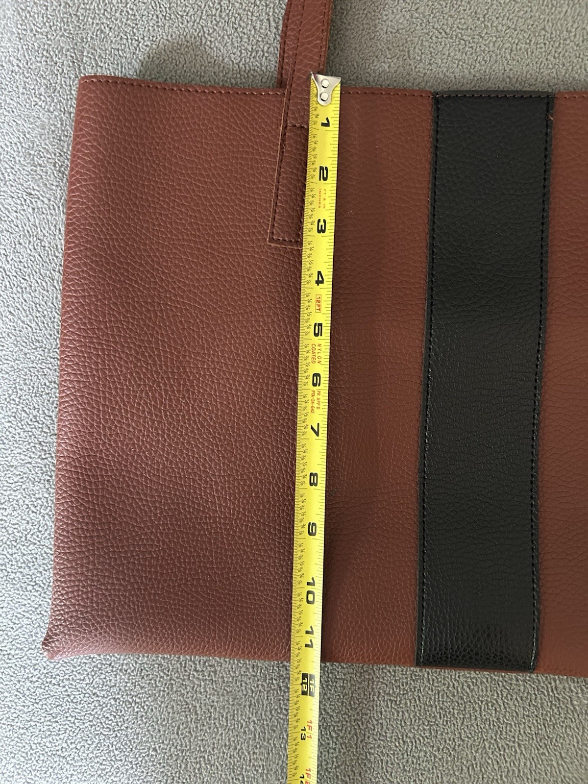 EUC!!! The Vince Camuto Vegan Leather Pebbled Tote Bag in brown with a black stripe is a stylish and spacious accessory for women. Made from faux leather, this large tote features a solid pattern with brown handles and lining, creating a sleek and sophisticated look. The pebbled texture adds a touch of detail to the exterior, while the vegan leather material ensures durability and cruelty-free fashion. Perfect for everyday use, this tote is a versatile and chic addition to any wardrobe.