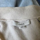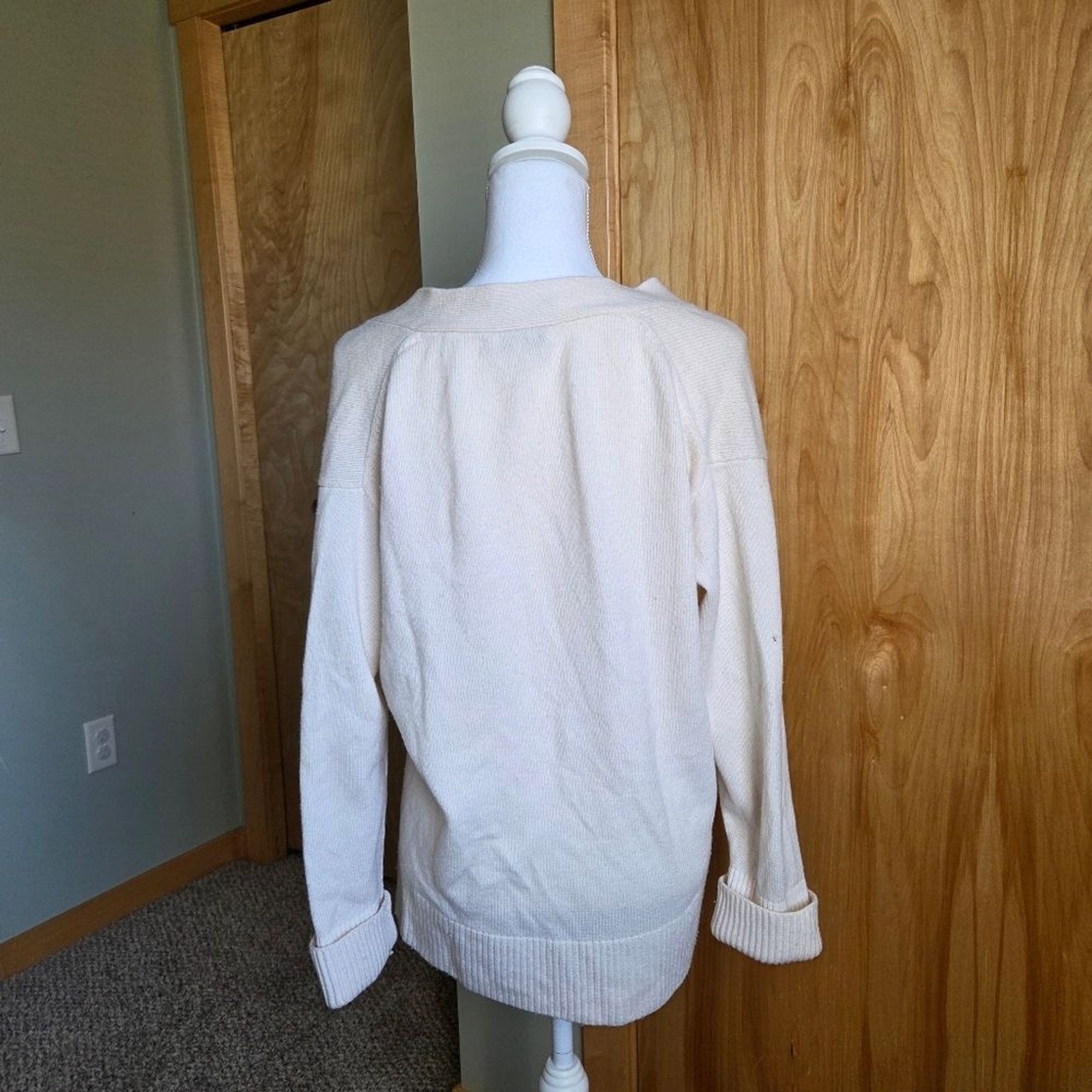 Fabric: Mid-weight knit V neck and long sleeves Ribbed trim Button placket Shell: 90% wool/10% cashmere Has a small hole on the sleeve and a few stains that can be removed, I just haven't attempted to strain treat them yet