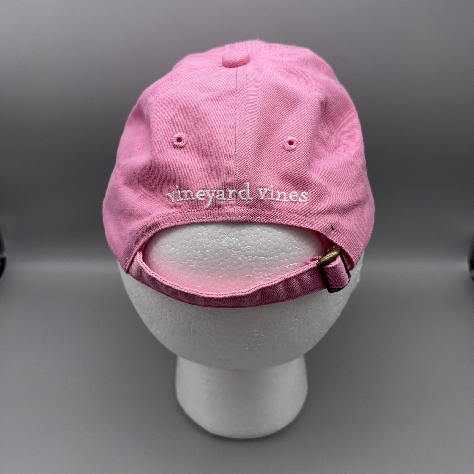 Vineyard Vines Hat Cap Strap Back Pink Whale Logo Cotton Baseball Dad Cap Mens Gently worn with minor signs of previous use. Fabric and sweatband are clean, brim holds shape, and embroidery, strap, and buckle are all intact. No stains, holes, or tears. Brand: Vineyard Vines Style: Strap back baseball dad mom hat cap with curved brim. Color: Pink with navy and white embroidered whale logo on the front and white embroidered "vineyard vines" script on the back. Material: 100% cotton (per interior tag); made in Vietnam. Details: Six-panel construction with stitched eyelets, adjustable fabric strap with metal slide buckle, interior Vineyard Vines logo taping, unstructured low-profile crown. Size: Adult adjustable strap back, designed to fit most head sizes (Mens/Unisex). 0681 Measurements: Previous washings may change sizing on the tag. Refer to photos above for all measurements. Compare our measurements to one of your favorite garments. Measurements are approximate. All items are bagged and sealed after being photographed, then stored in a smoke free environment. Washed per eBay standards. I carefully package and ship daily. Contact me with any questions. Thanks