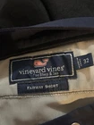 The product is a pair of Men's Vineyard Vines performance chino shorts in navy blue with a 32-inch waist size and 7-inch inseam. These casual shorts feature a solid pattern, flat front design, and whale logo detail. Perfect for a day out on the golf course or just lounging around, these stylish and comfortable shorts offer a classic chino style with a touch of modern flair.