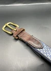 Elevate your style with this Vineyard Vines belt featuring a playful whale pattern. Made in the USA with high-quality materials including polyester, brass, leather, and cotton, this belt is perfect for any occasion. The multicolor design and classic style make it a great addition to any wardrobe. This men's belt has a 30-inch size and features a buckle closure with a braided/woven design. The logo accents and animal print pattern add a touch of fun to this classic piece. Whether you're hitting the golf course or adding some color to your everyday outfit, this Vineyard Vines belt is the perfect choice. Some wear overall good condition.