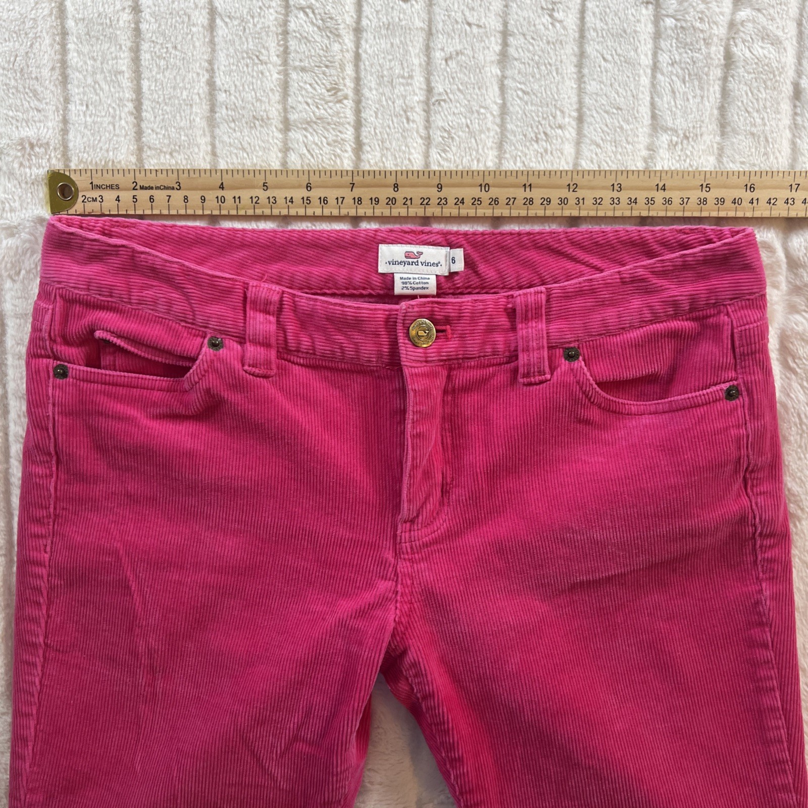 These Vineyard Vines Corduroy women's pants in size 6 are a vibrant hot pink color, perfect for adding a pop to your wardrobe. Made from a stretch cotton fabric with a corduroy texture, these skinny pants feature a flat front design with a mid-rise fit. The pants have a straight leg style and a 25-inch inseam, making them ideal for casual, party, or travel occasions during the summer, fall, or spring seasons. Easy to care for with machine washable instructions, these pants offer comfort and lightweight wear with stylish accents like button and zipper closures.