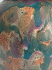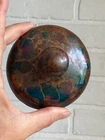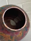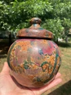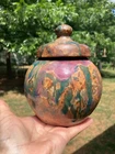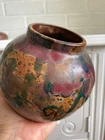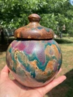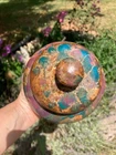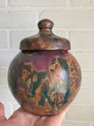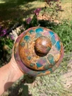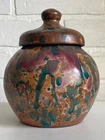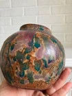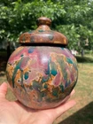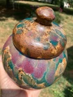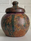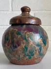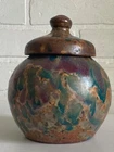Vintage studio pottery round crock / jar with lid by Betty Coble. Made in a gorgeous multi colored drip glaze in oramge, green, blue, raspberry, lavender, brown and some cream. This is a heavy piece for its size. Found in NC. Please email us with any questions and please check our Ebay store, Hooked-On-Vintage, for more great vintage items. We combine ship! :-)