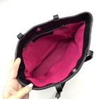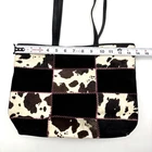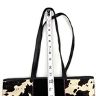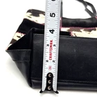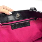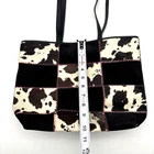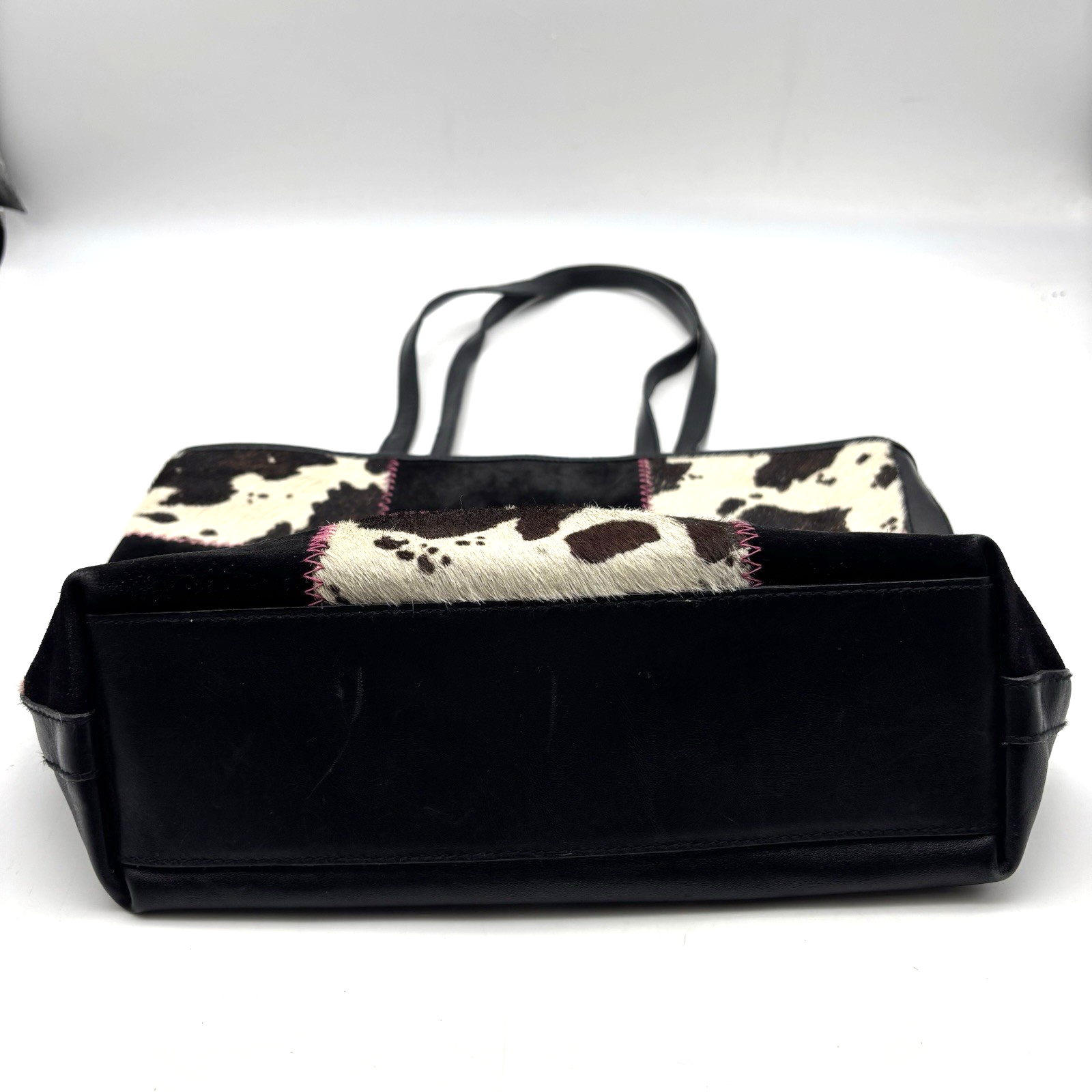 Vintage 00s Y2K Harold Powell Tote Bag Made in Italy Black Genuine Leather Body Black Suede Leather & Patchwork Cowhide Design Hot Pink Contrast Stitch Embroidery on Front Black Genuine Leather Double Shoulder Straps Magnetic Closure Hot Pink Fabric Lining 1 Zip Pocket Inside Measurements: 14" wide 10.5" tall 4" deep 11.5" strap drop Great vintage pre owned condition. Gently owned. Small stain on inner lining near zip pocket. One small area of fur has shed near the base of the purse. Flaws shown in photos. Clean and from a smoke free home.