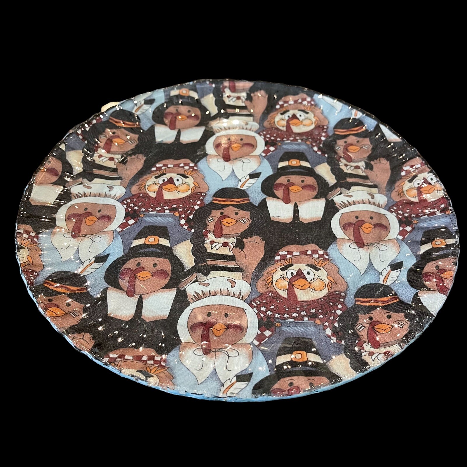 Vintage Clear Cased Glass Serving Plate Pilgrim Turkey Thanksgiving Pattern 10" 10" diameter. Clear glass with turkey pattern applied at back with a blue glitter backing. Scalloped rim.