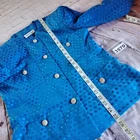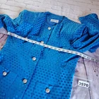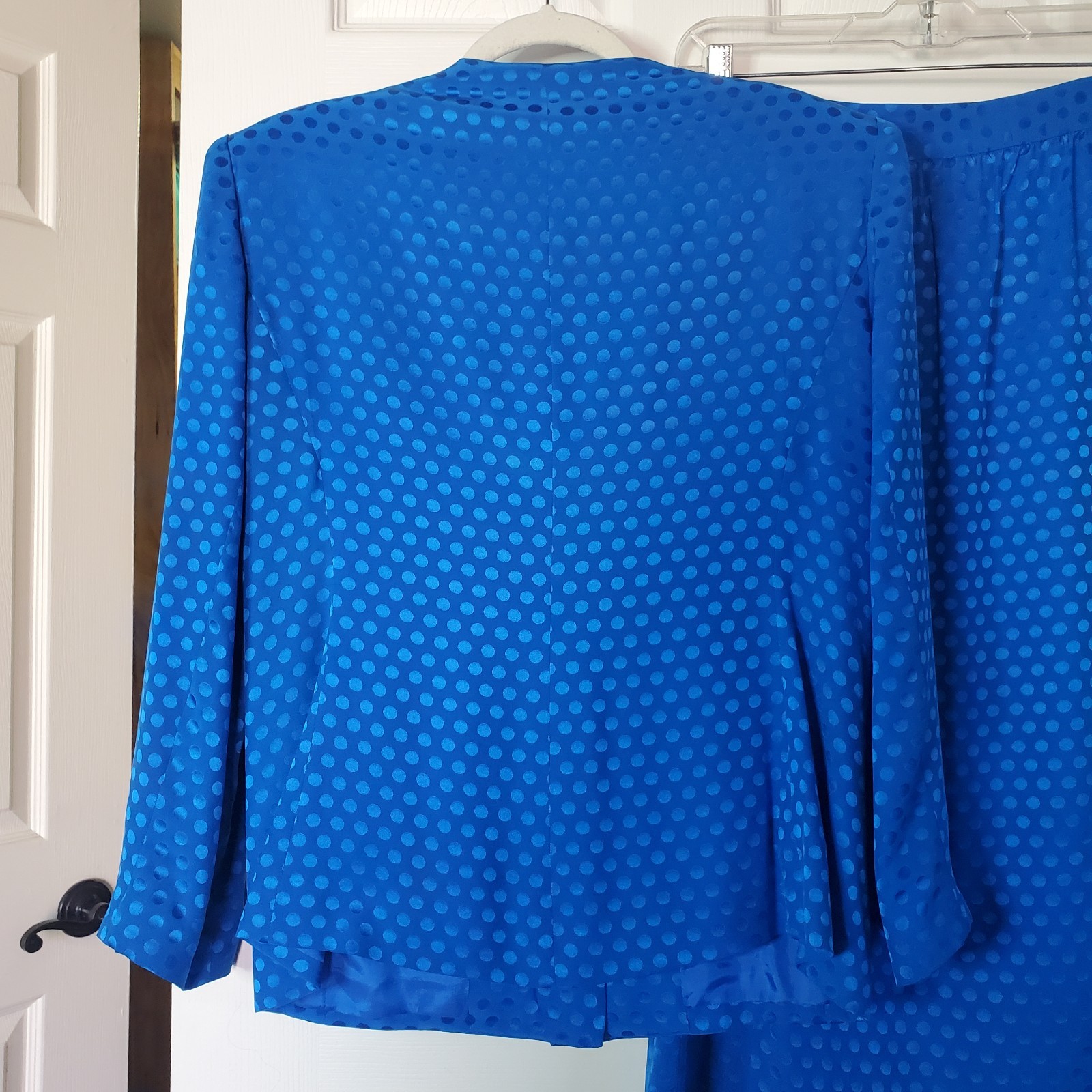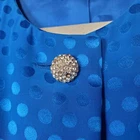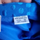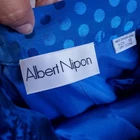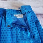 Step out in style with this elegant blue polka dot skirt set by Albert Nipon. The top has shoulder pads with rhinestones buttons. The skirt is pencil style with side zip. Please see pictures for details and let me know if you have any questions I ship the next business day Flaws: one of the buttons is missing a couple of rhinestones as shown in pictures.
