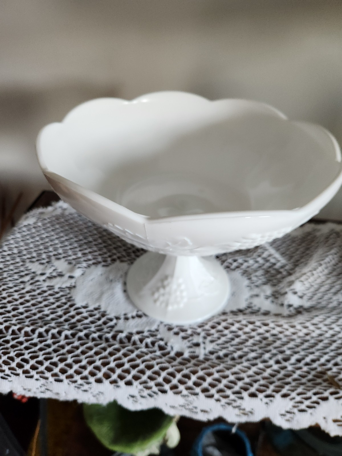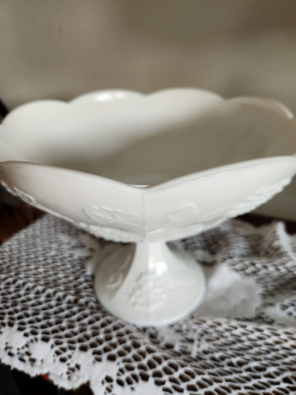 Add a touch of vintage charm to your home decor with this beautiful 10” Indiana Colony White Milk Glass Grape Harvest Pedestal Fruit Bowl. The bowl features a stunning harvest pattern with grapes and leaves that wraps around the outside of the bowl, giving it a colonial style. The bowl is made of thick, durable milk glass and has a sturdy pedestal base measuring 5 inches in length and 3.75 inches in depth. This vintage original bowl is in excellent condition and is perfect for serving fruits, salads, and other dishes. The bowl weighs 3.5 pounds and has a width of 10 inches. The production style of the bowl is milk glass, and it is handmade. The bowl is a great addition to your collection and is perfect for display.