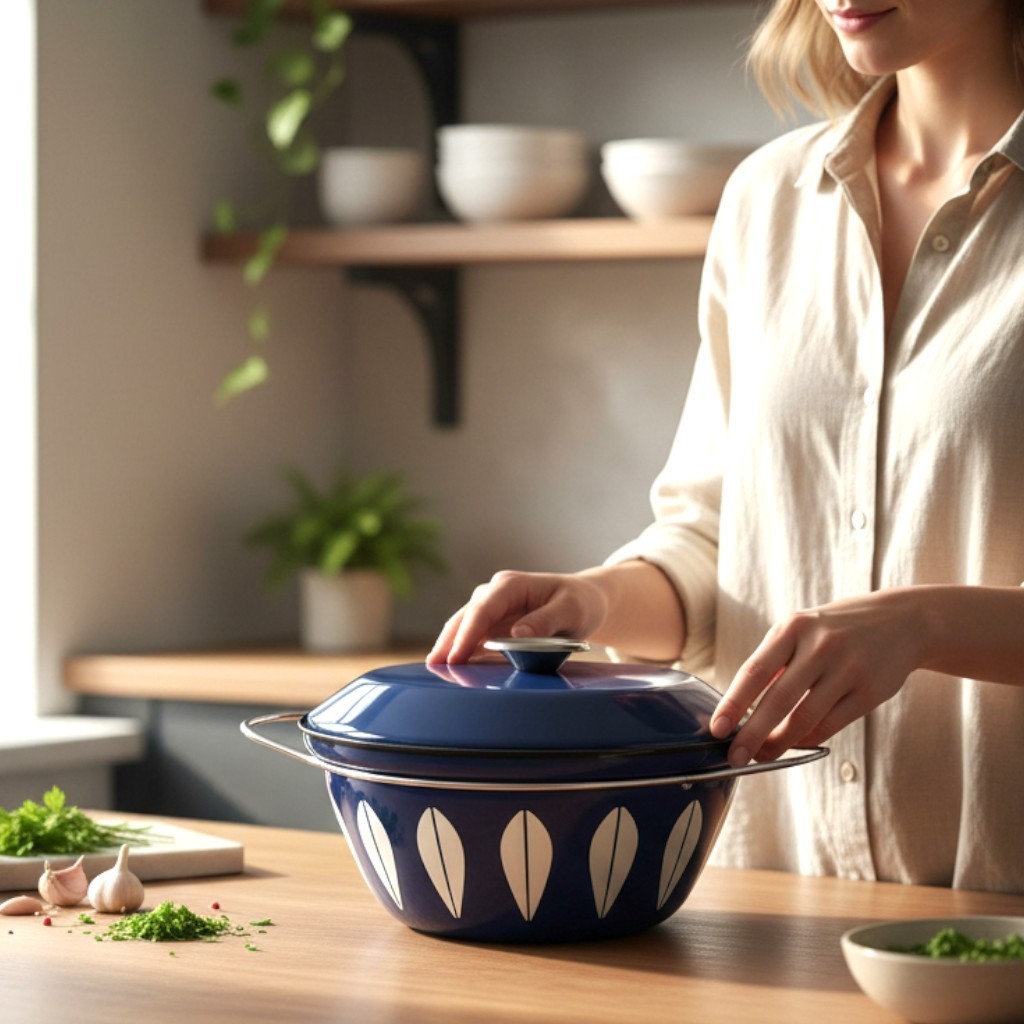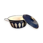 This vintage 11" Cathrineholm White Lotus on Blue Enamelware stockpot is a unique and collectible piece of cookware made in Norway. The round stockpot features a blue color with a white lotus design, adding a touch of retro charm to any kitchen. With a capacity of 8 quarts and compatibility with both electric and gas stoves, this two-piece set includes a lid and is perfect for any cooking enthusiast looking for a vintage addition to their collection. Exceptional condition.