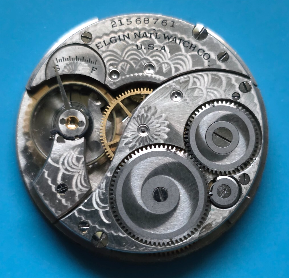 From the American Horology Archive : Elgin National Watch Co. Grade: 301 Manufacturer: Elgin Manufacturer Location: Elgin, Illinois Movement Serial Number: 21568761 Grade: 301 Model: 2 Class: 113 Estimated Production Year: 1919 Run Quantity: 3,000 Grade/Model Run: 199 of 273 Grade/Model Total Production: 455,000 Size: 12s Jewels: 7j Movement Configuration: Hunting Movement Finish: Nickel Movement Setting: Pendant Plate: 3/4 Plate Double Roller: Yes Barrel: Going Balance Type: Expansion Balance Jewel Material: Ruby Train: Quick Regulator: Plain Hairspring: Breguet Standard Dial Type: Single-Sunk Adjusted: No Railroad Grade: No U.S. Patents: 596407 , 77078 , 585025 Case: Various Run ID: 10750.301G199.12S1583.122M760.H6147.P7941.7J4505 Data Research: 1927/1950 Elgin Serial List Database Version: v52.712